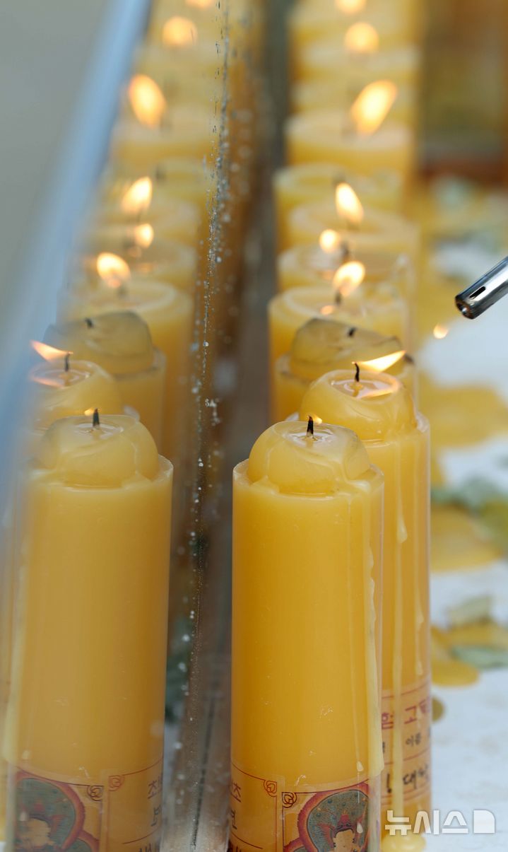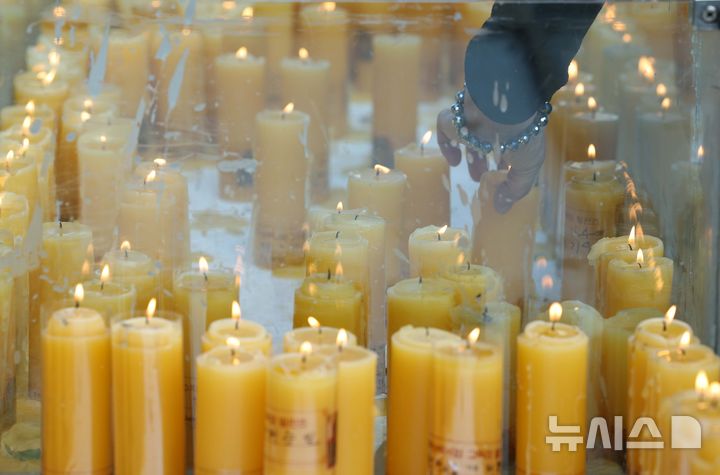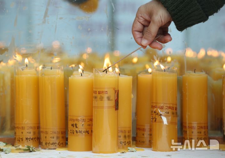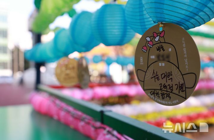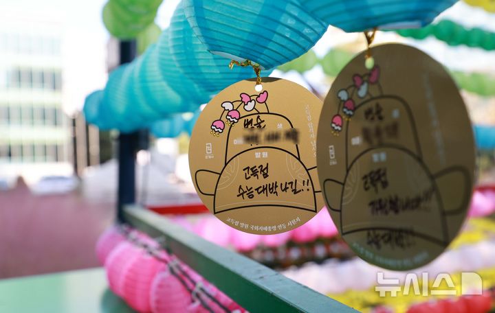 【NEWSIS】2025年度大学修学能力試験(大学入学共通テストに相当)の開始があすに迫った13日、ソウル市鍾路区の曹渓寺では、高得点などを祈る所願紙(願い事を書いた紙)がランタンに取り付けられていた。