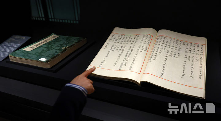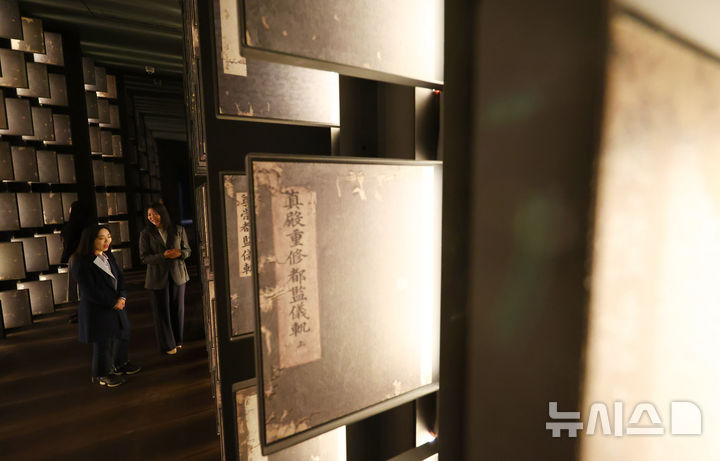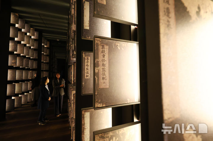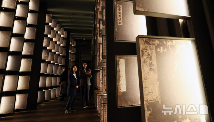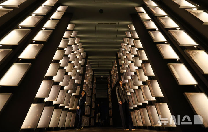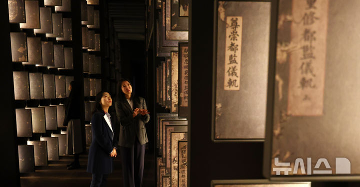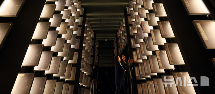 ソウル市竜山区の国立中央博物館で14日、外奎章閣儀軌室開館に当たってメディア公開イベントが行われ、関係者たちが展示室を見て回る様子。