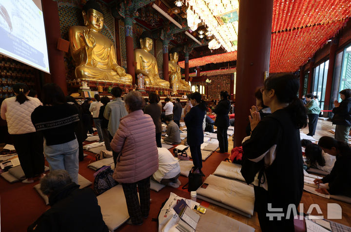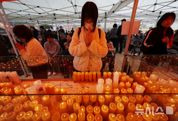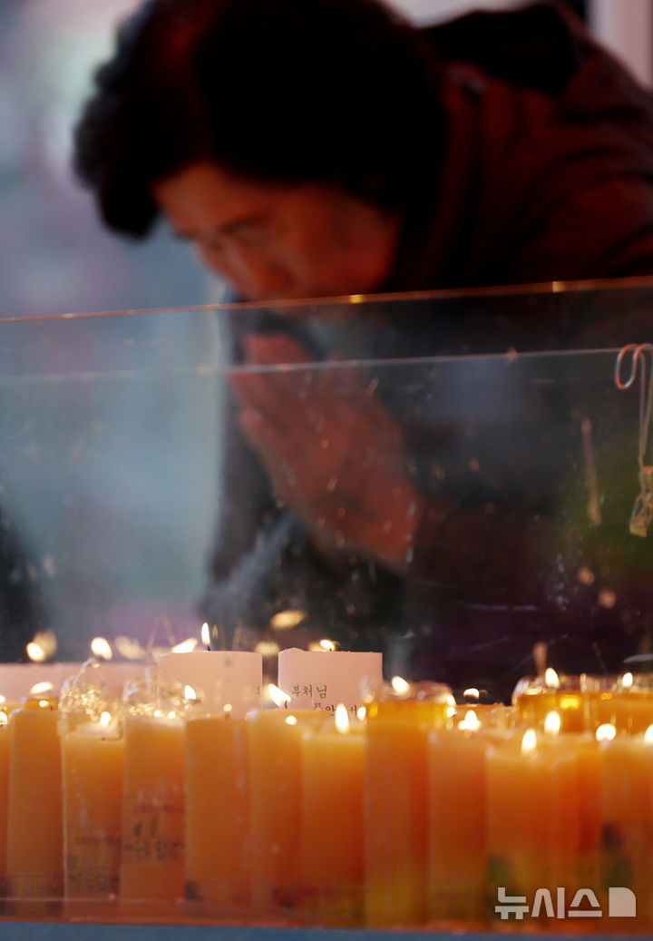 【NEWSIS】2025年度大学修学能力試験(修能。大学入学共通テストに相当)が始まった14日、ソウル市鍾路区の曹渓寺では、訪れた信徒たちが受験生のためにろうそく供養を行っていた。