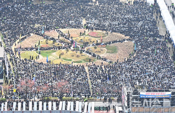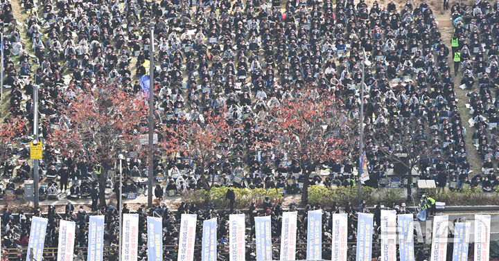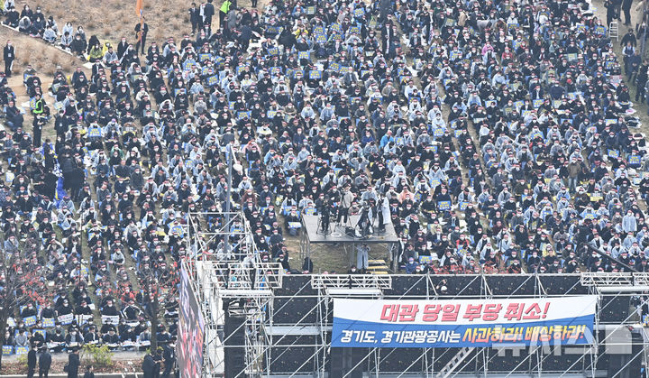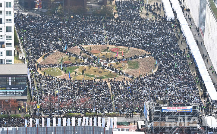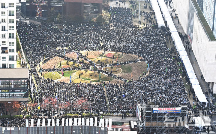 【NEWSIS】数万人に上る「新天地イエス教証しの幕屋聖殿」(新天地イエス教会)信徒が15日、京畿道水原市霊通区の京畿道庁前で集会を開いている様子。