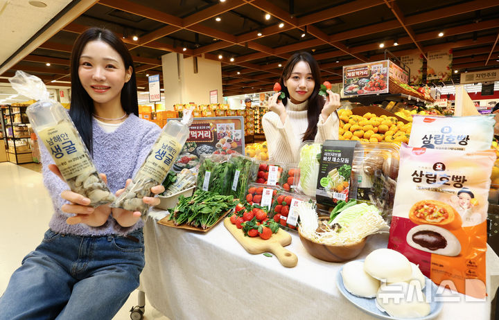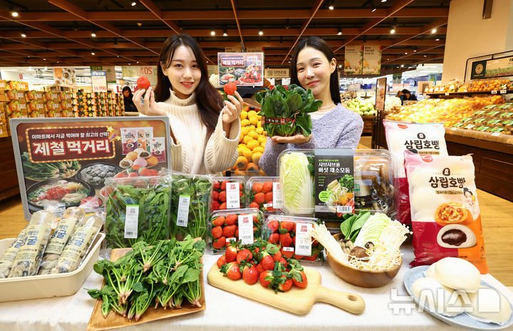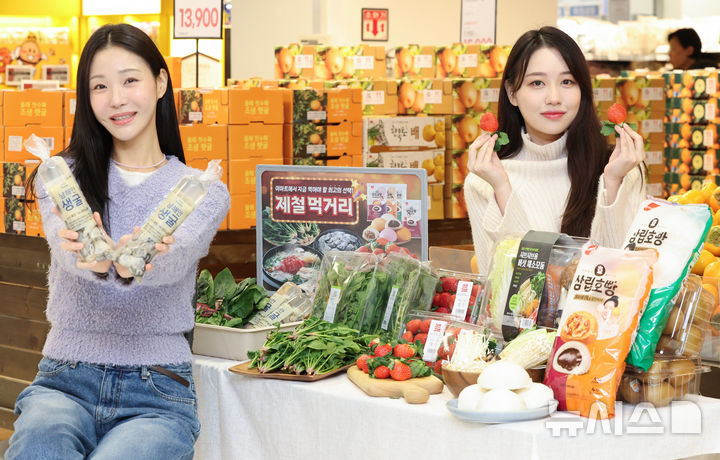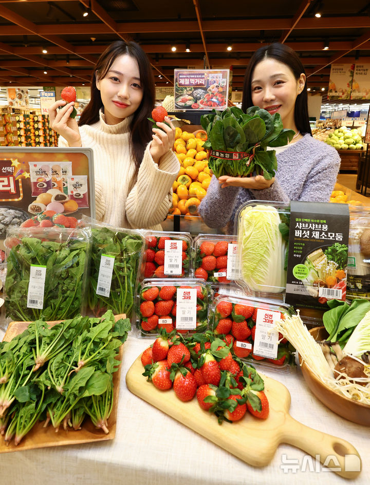 【NEWSIS】ソウル市竜山区の大手スーパー「Eマート竜山店」で21日、この時期に旬を迎える初冬の味覚を集めたイベントを紹介しているコンパニオンの様子。Eマートは22日から28日まで、いちごの「雪香」やほうれん草、カキなど初冬の味覚をサービス価格で販売する。