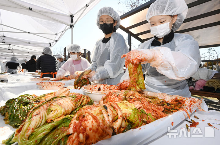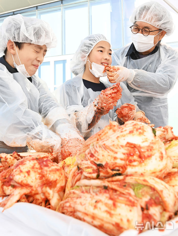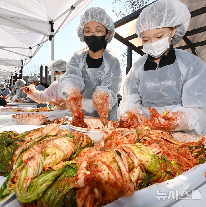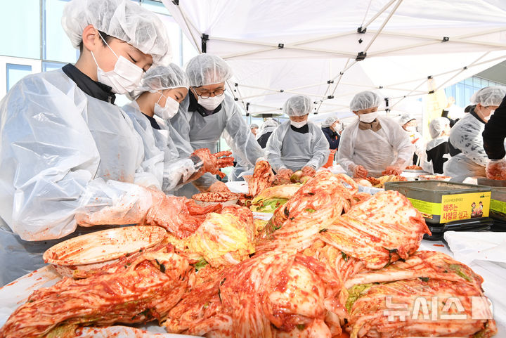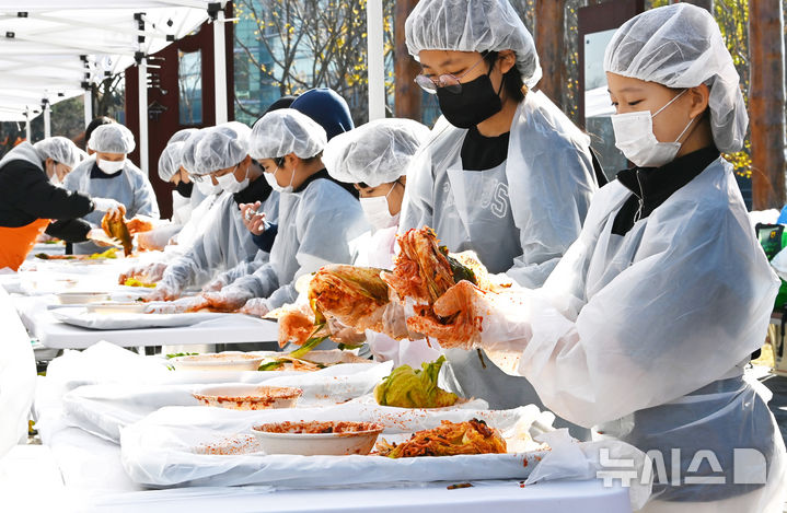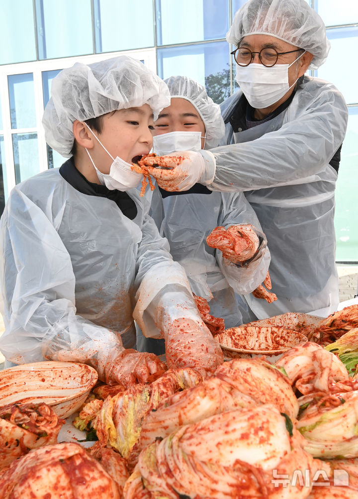 キムチの日に当たる11月22日、京畿道水原市勧善区の国立農業博物館で愛のキムジャン(越冬用のキムチ漬け)分かち合いイベントが行われ、水原市内にある九雲小学校の児童たちが恵まれない人たちに届けるキムチを漬けた。