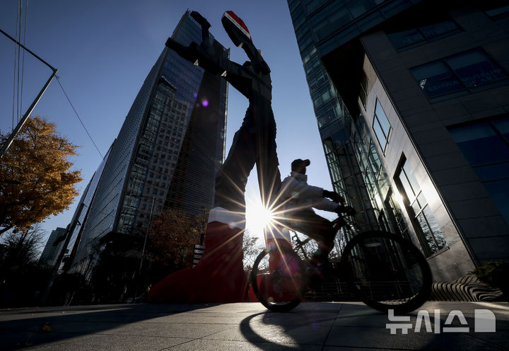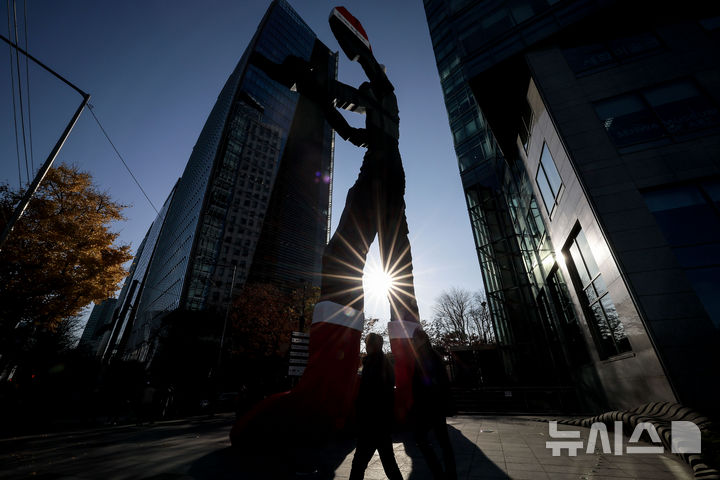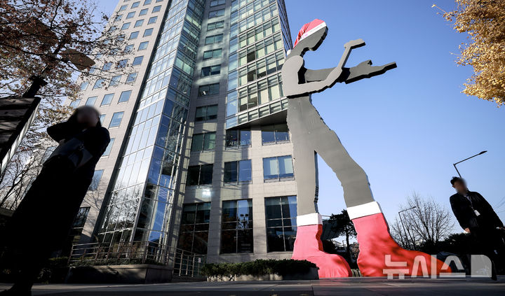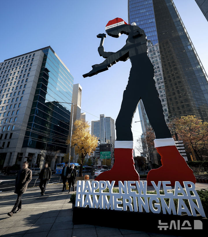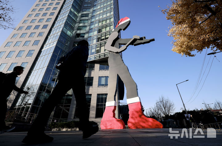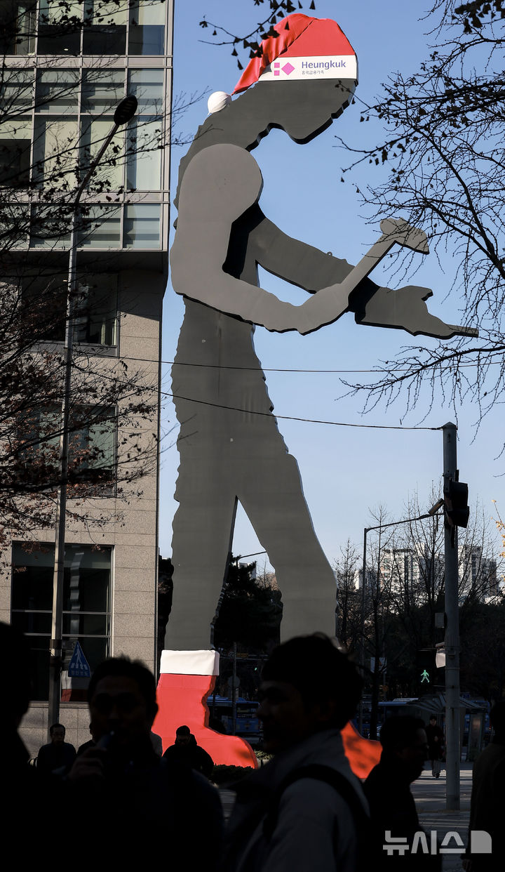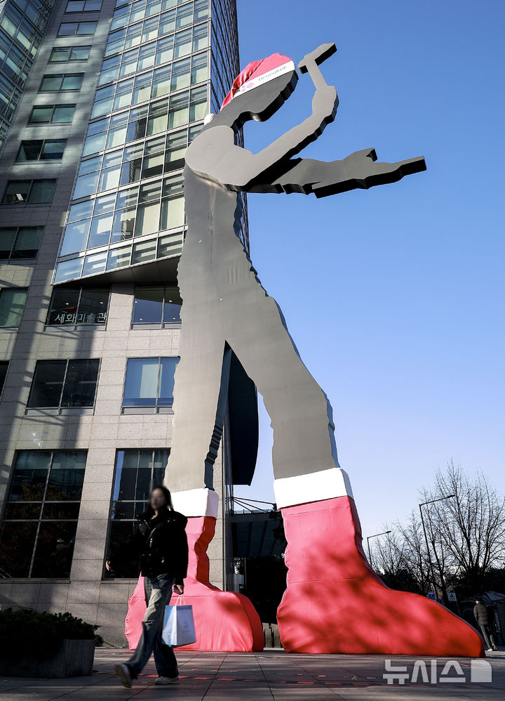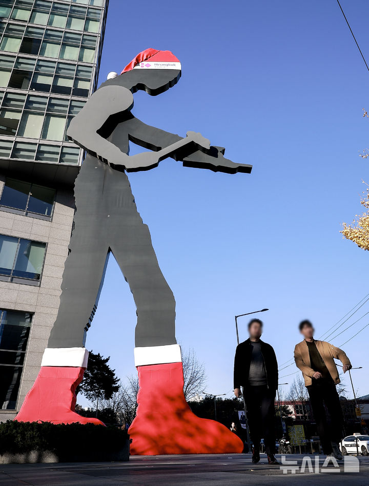 ソウル市鍾路区のセファ美術館前にあるオブジェ「Hammering Man」が25日、サンタクロースの帽子をかぶっていた。セファ美術館は来年1月初めまで、「ハッピーニューイヤーHammering Man2024」と題し、パブリックアートの価値を広める「ハンマリング・ウィッシュ」イベントを開催する。