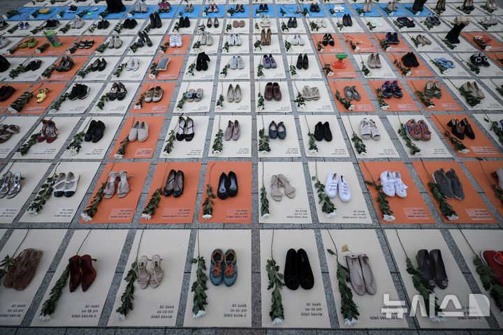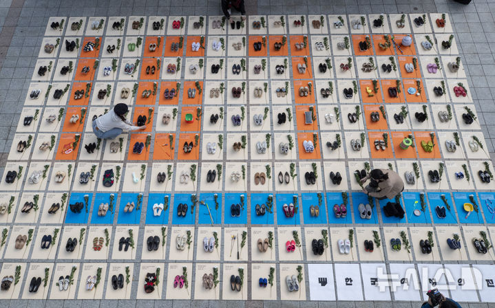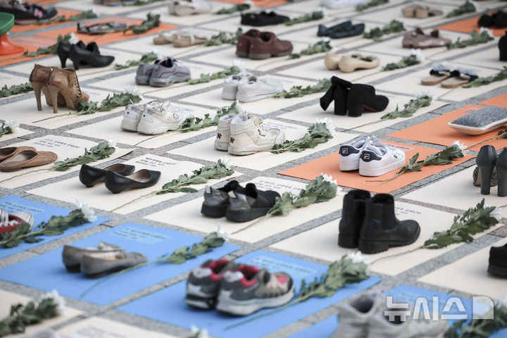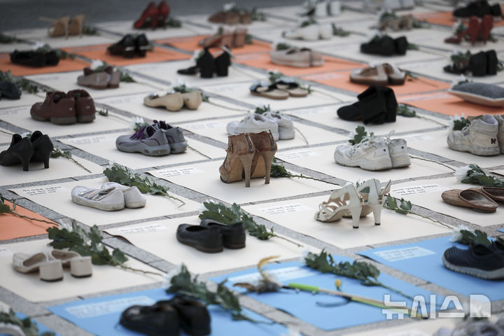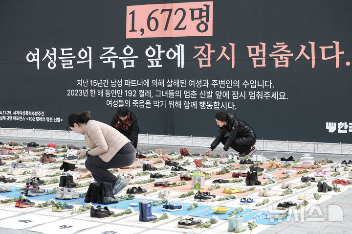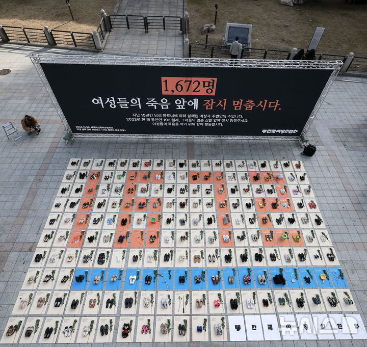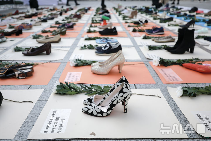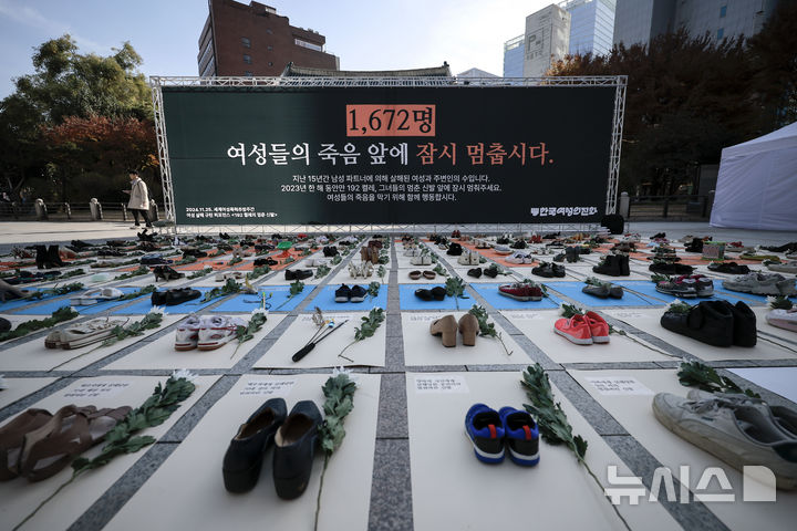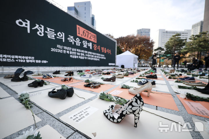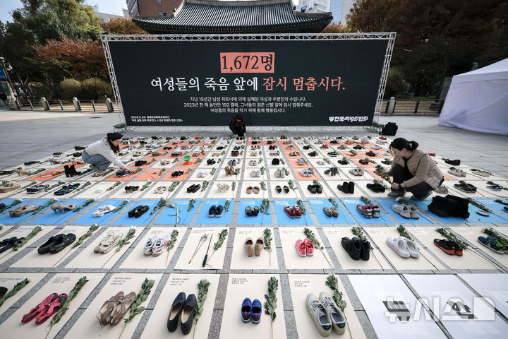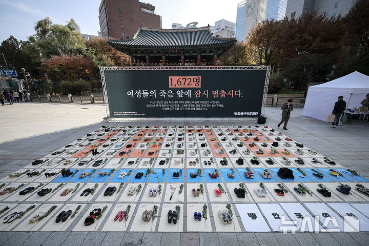 【NEWSIS】「韓国女性ホットライン」の関係者が25日、ソウル市鍾路区の普信閣前で、女性殺害糾弾パフォーマンスを行っているところ。