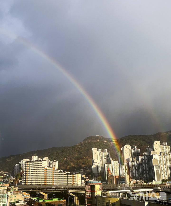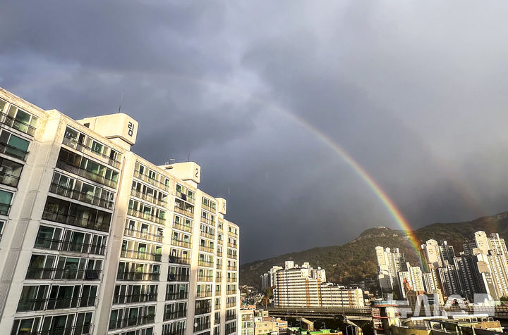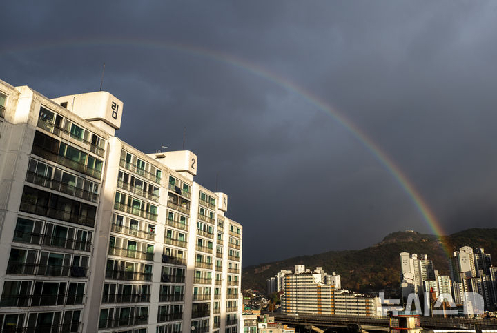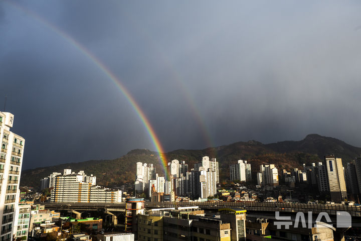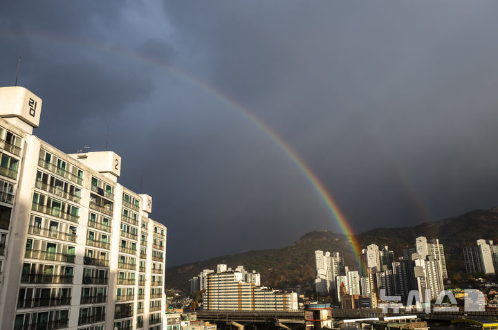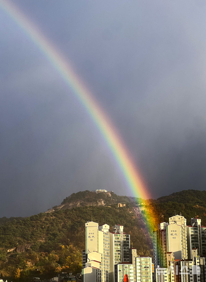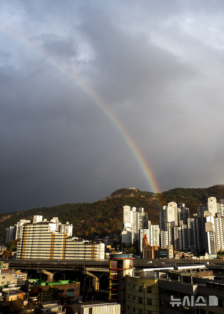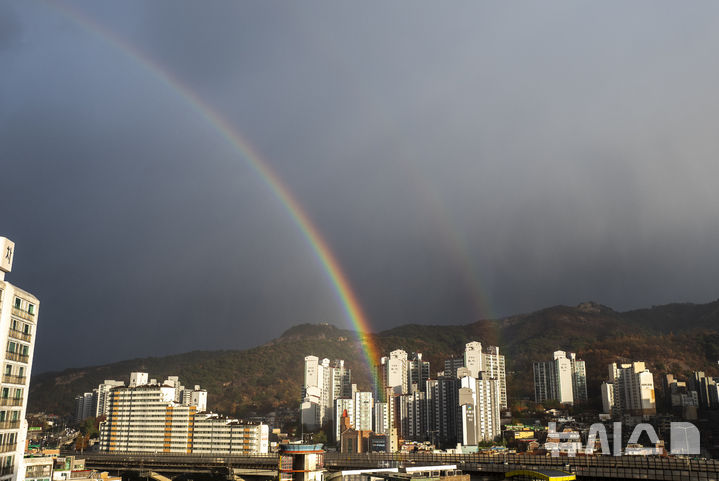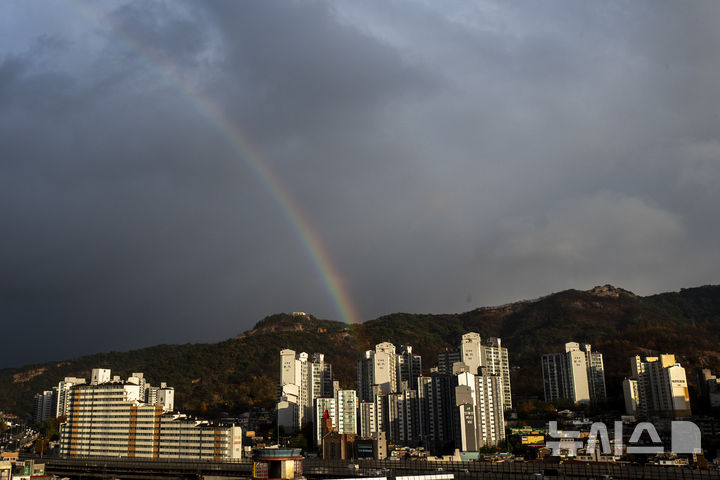 【NEWSIS】雨が降ったりやんだりを繰り返した26日、ソウル市西大門区弘恩洞の空に虹がかかった。