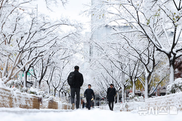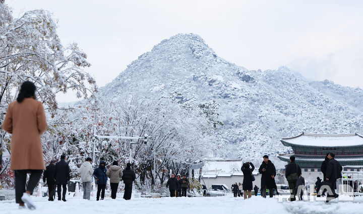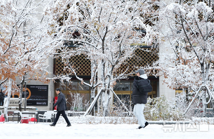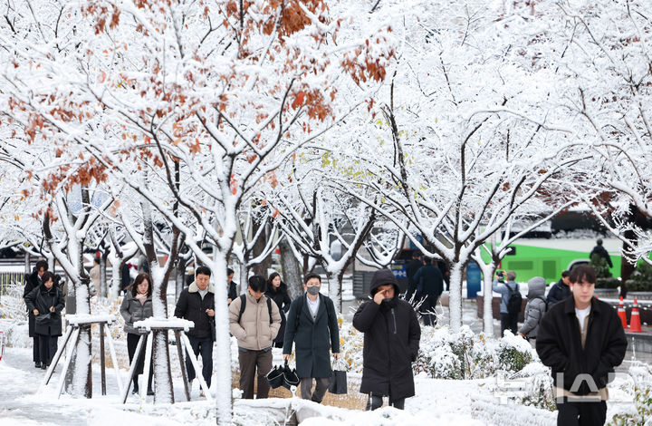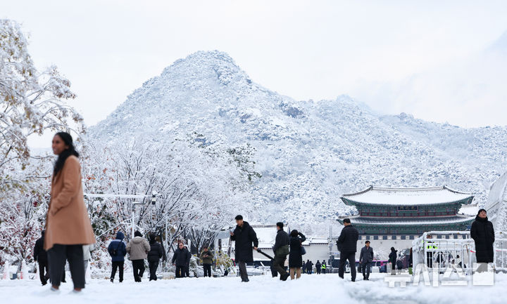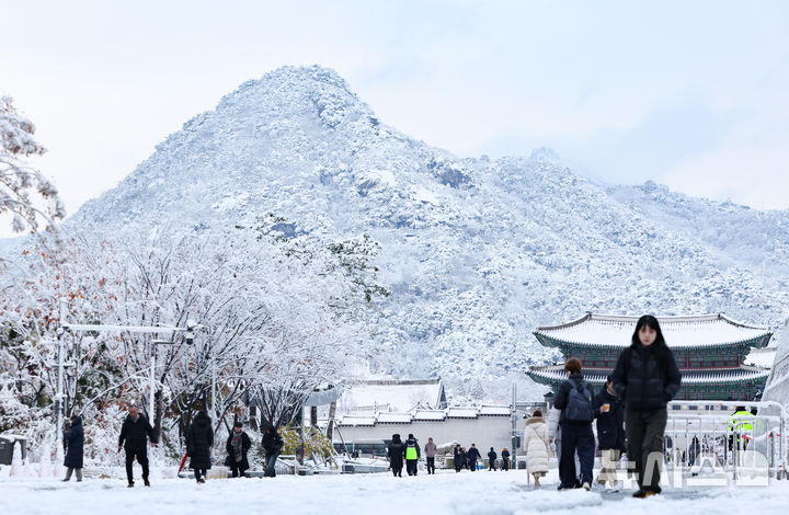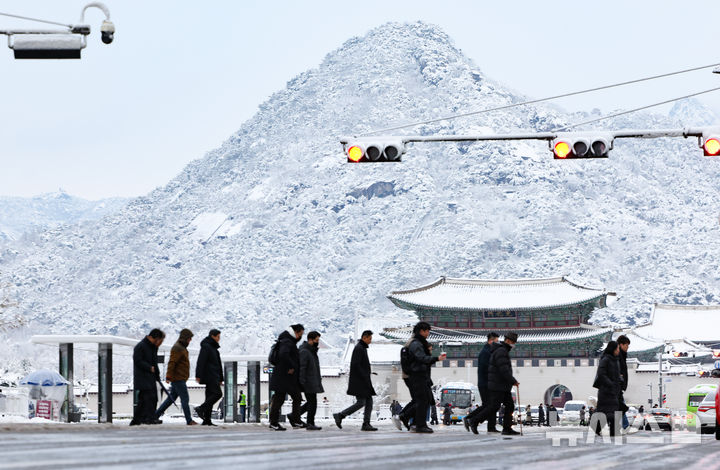 【NEWSIS】ソウル市内に大雪特別警報が発令された27日午前、ソウル市鍾路区で、雪が積もった光化門広場の前を歩いて出勤する人々。