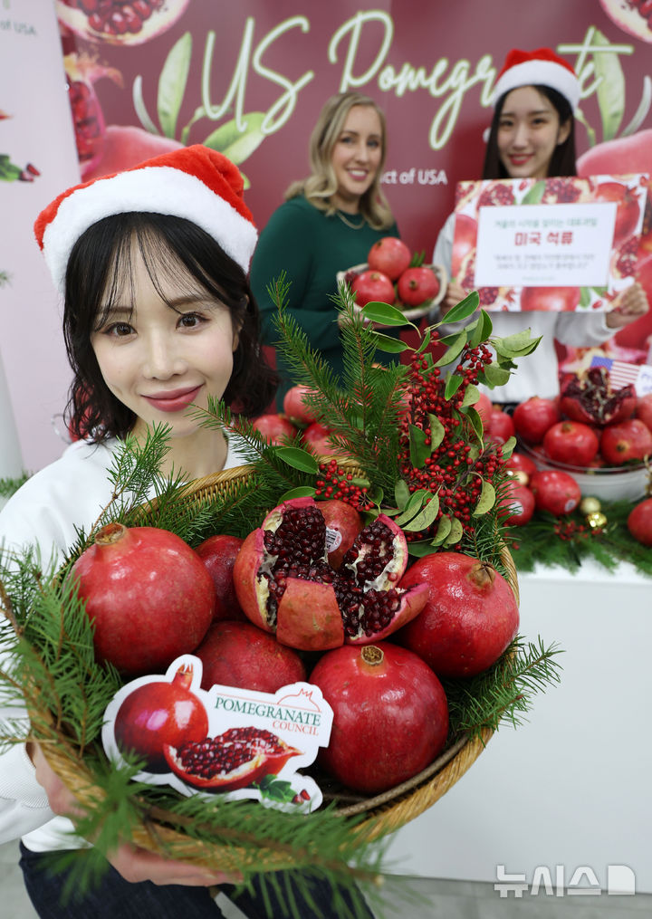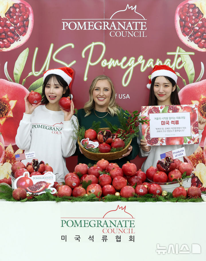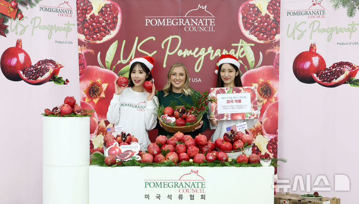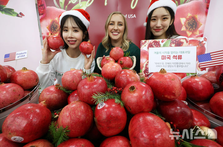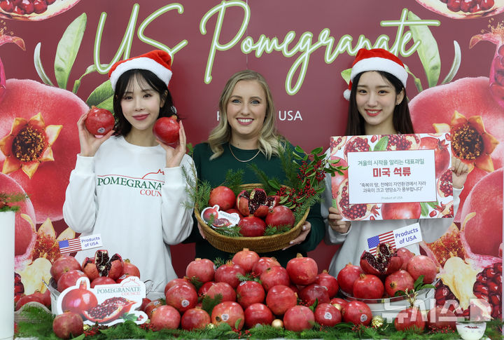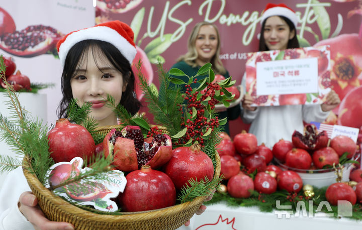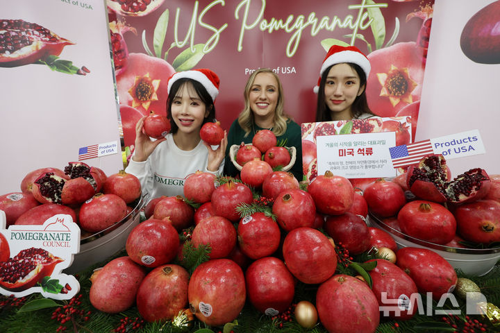 ソウル市内のロッテマートZETTAPLEXソウル駅店で28日、イベントコンパニオンらが米国産ザクロをPRした。米国産ザクロはカリフォルニアの自然環境で育ったプレミアム・フルーツで、他地域のザクロに比べ色が一段と濃く、果肉が大きく、ジューシーで、果皮がぴんと張っているのが特徴だ。11月末から1月にかけて、韓国国内の大型スーパーやデパート、オンライン・ショッピングモールで購入可能だ。