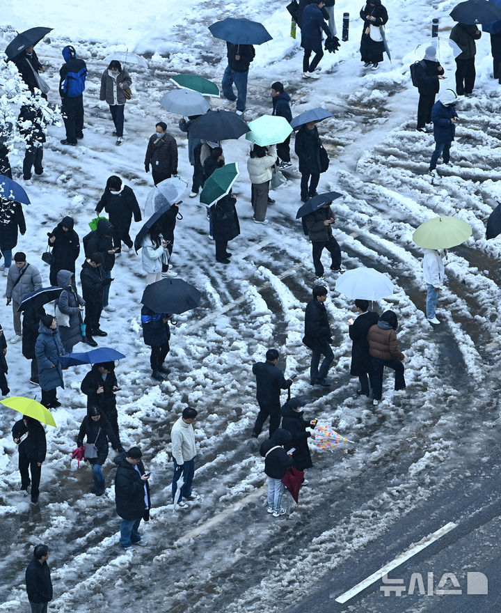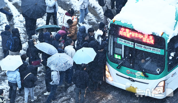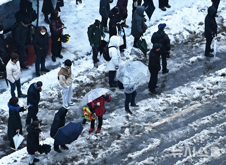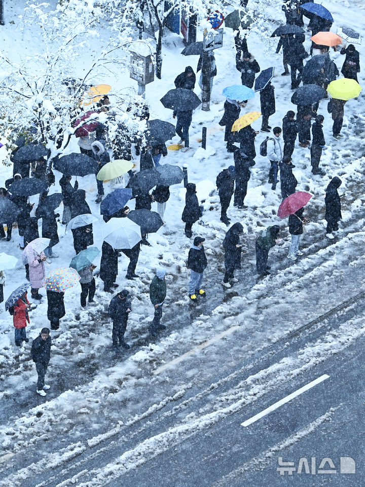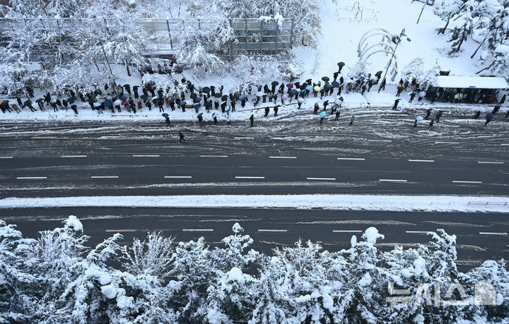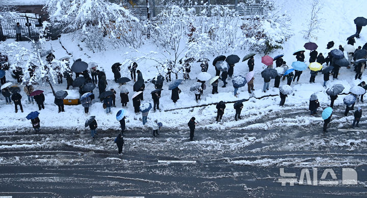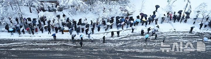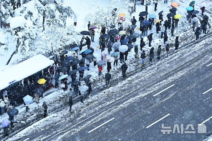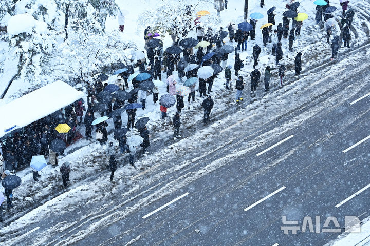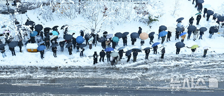 首都圏地域で大雪が降った28日、京畿道水原市霊通区網浦洞のバス停で、出勤する市民たちがバスを待っている様子。