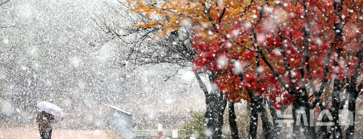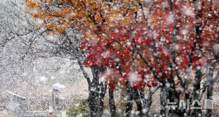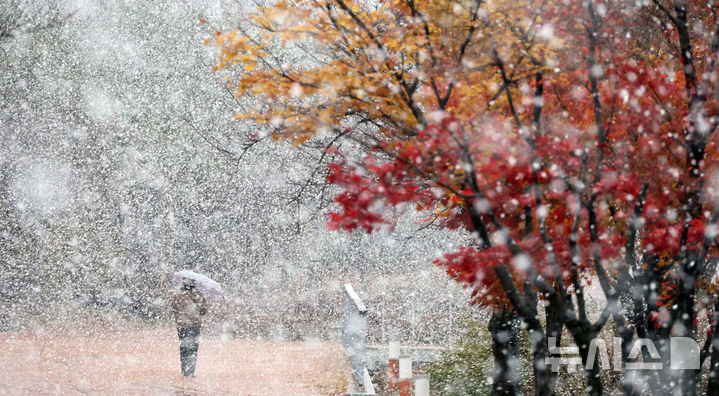 【NEWSIS】今冬の初雪が降った27日、世宗市オジン洞で、紅葉したモミジの木々のをそばを雨傘を差して通り過ぎる市民の様子。