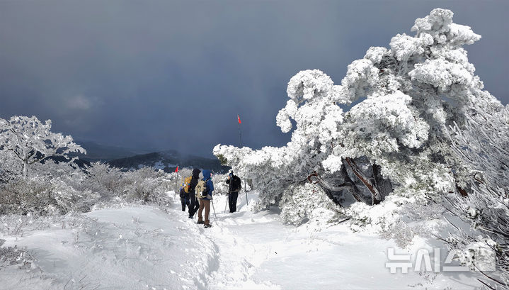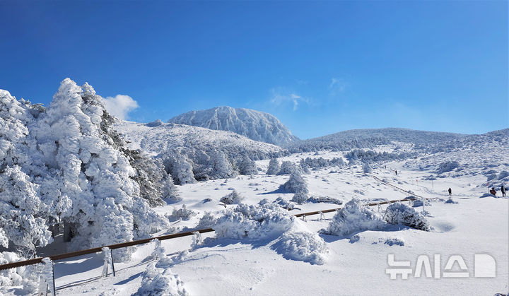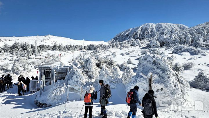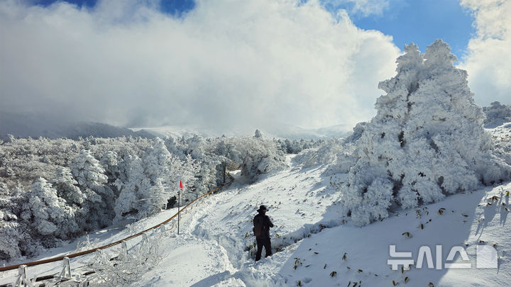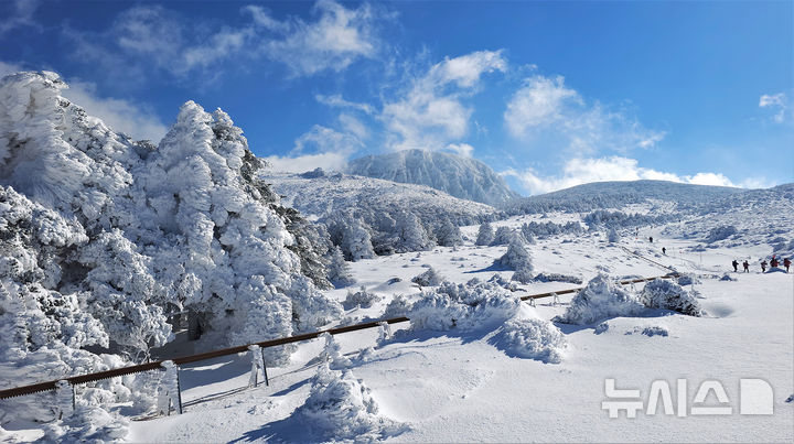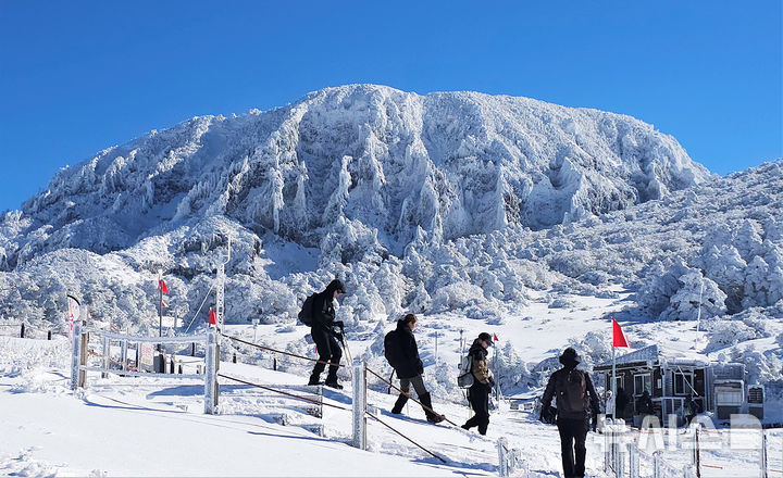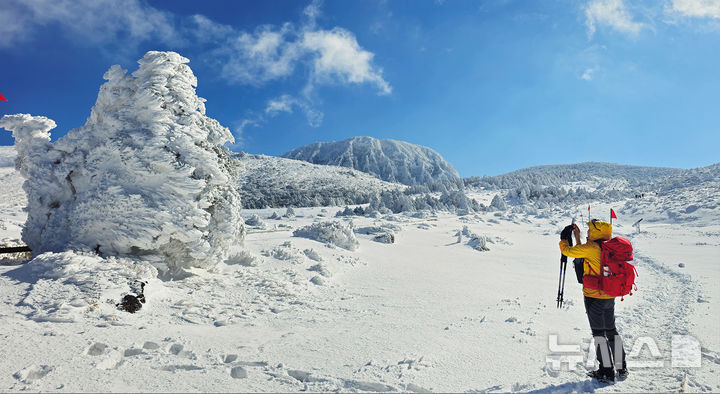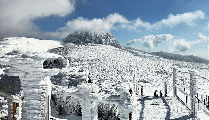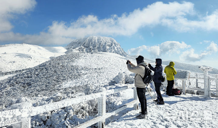三日間降っていた雪がやみ、青空が広がった11月30日、済州島の漢拏山は雪の王国のように変わり、見事な雪景色で観光客を迎えた。