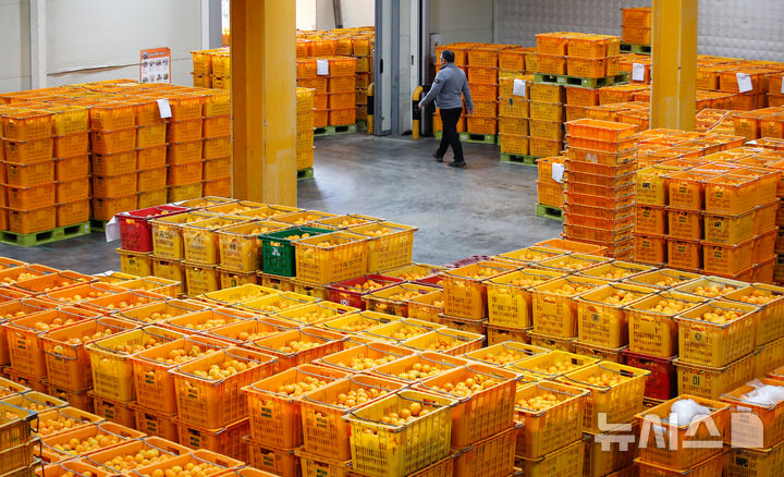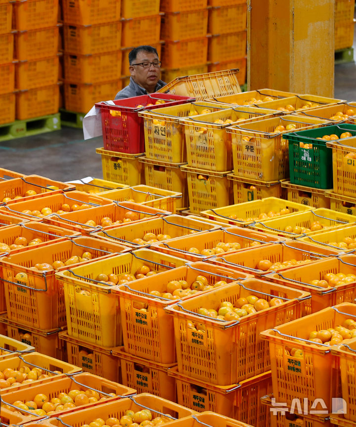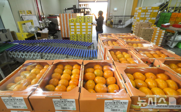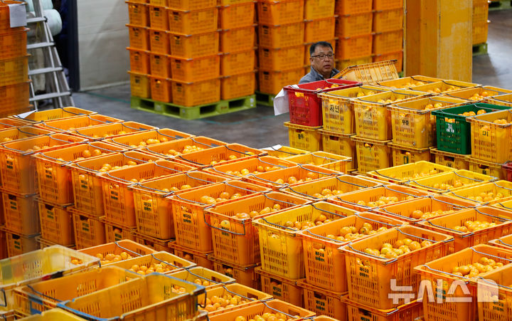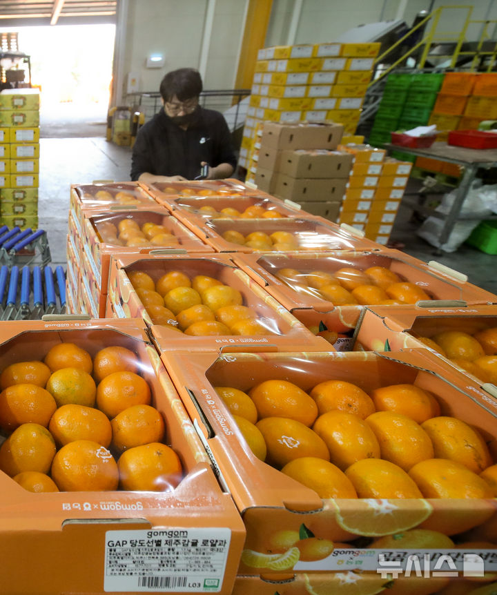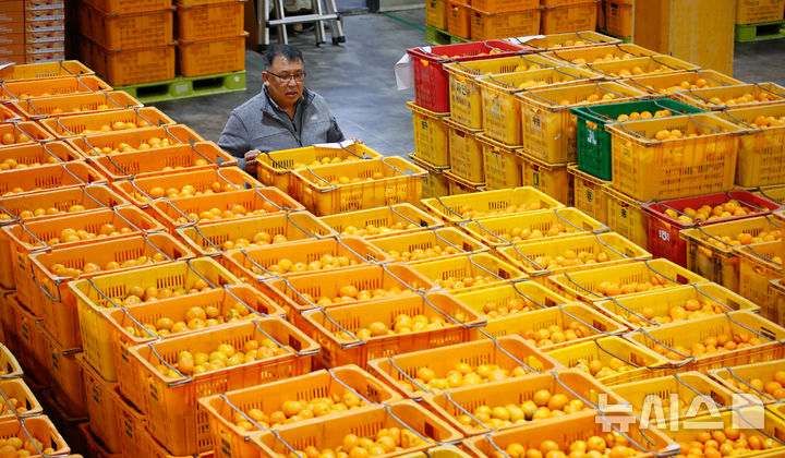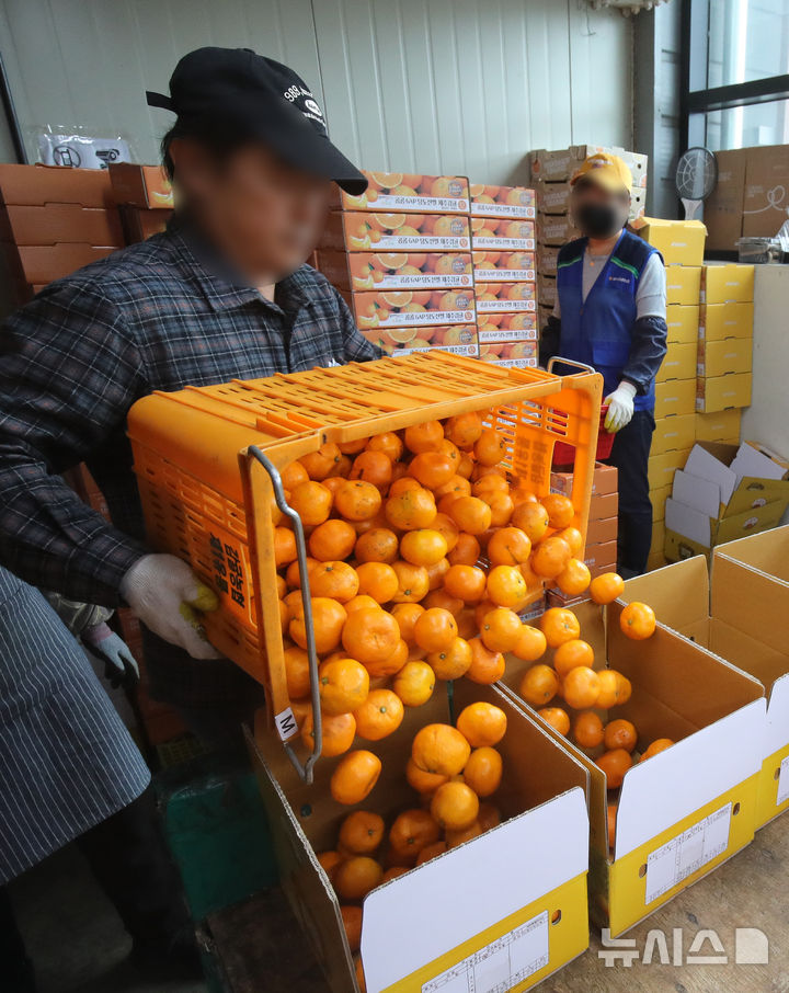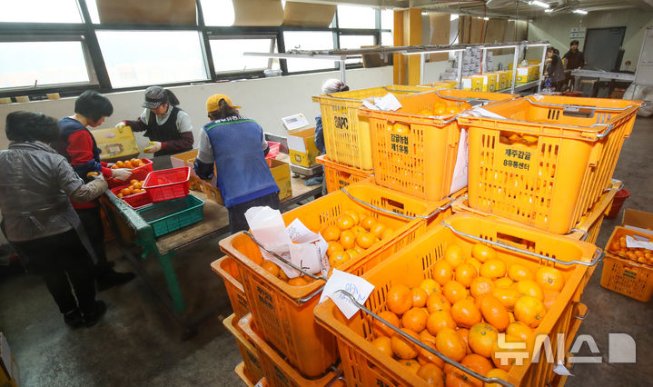 【NEWSIS】済州市道南洞の済州柑橘農協第8流通センターで3日午前、柑橘類の選果作業を行っている関係者の様子。済州農産物需給管理センターが集計した韓国9大卸売市場の露地柑橘5キロ当たりの平均価格は、最近1週間で1万2400ウォン(現在のレートで約1326円。以下同じ。)を記録し、これは1997年に柑橘類の価格調査が始まって以来最も高かった昨年の1万200ウォン(約1091円)より20%以上も高い。