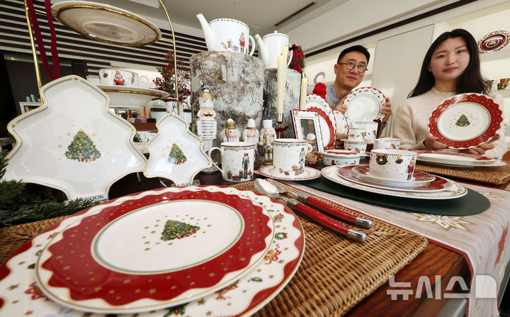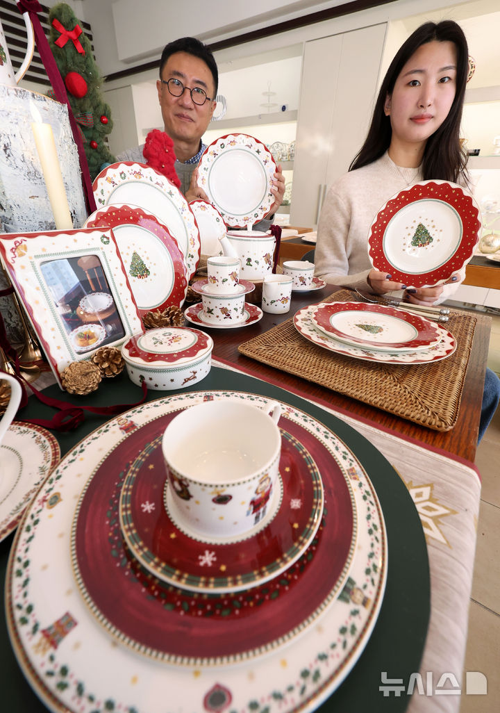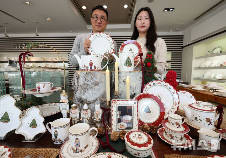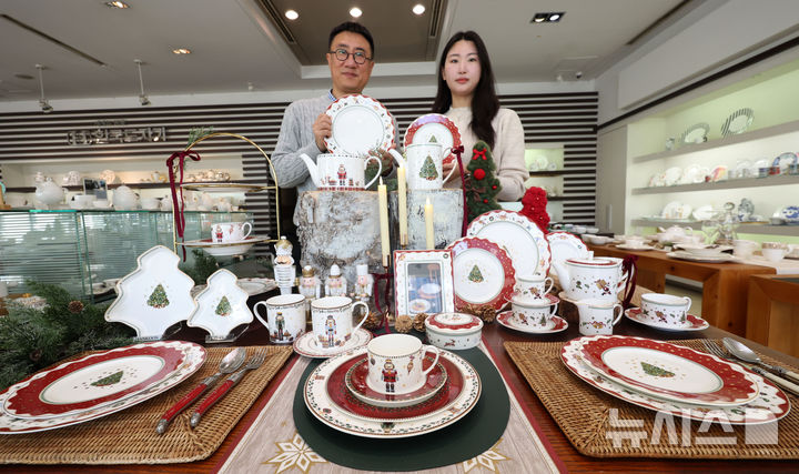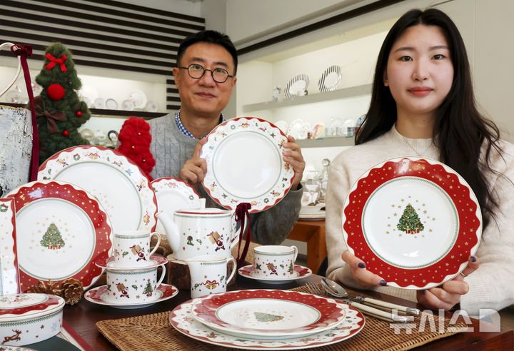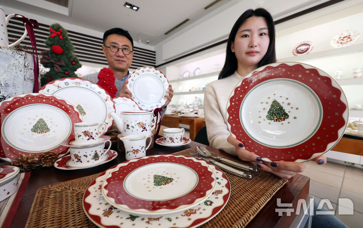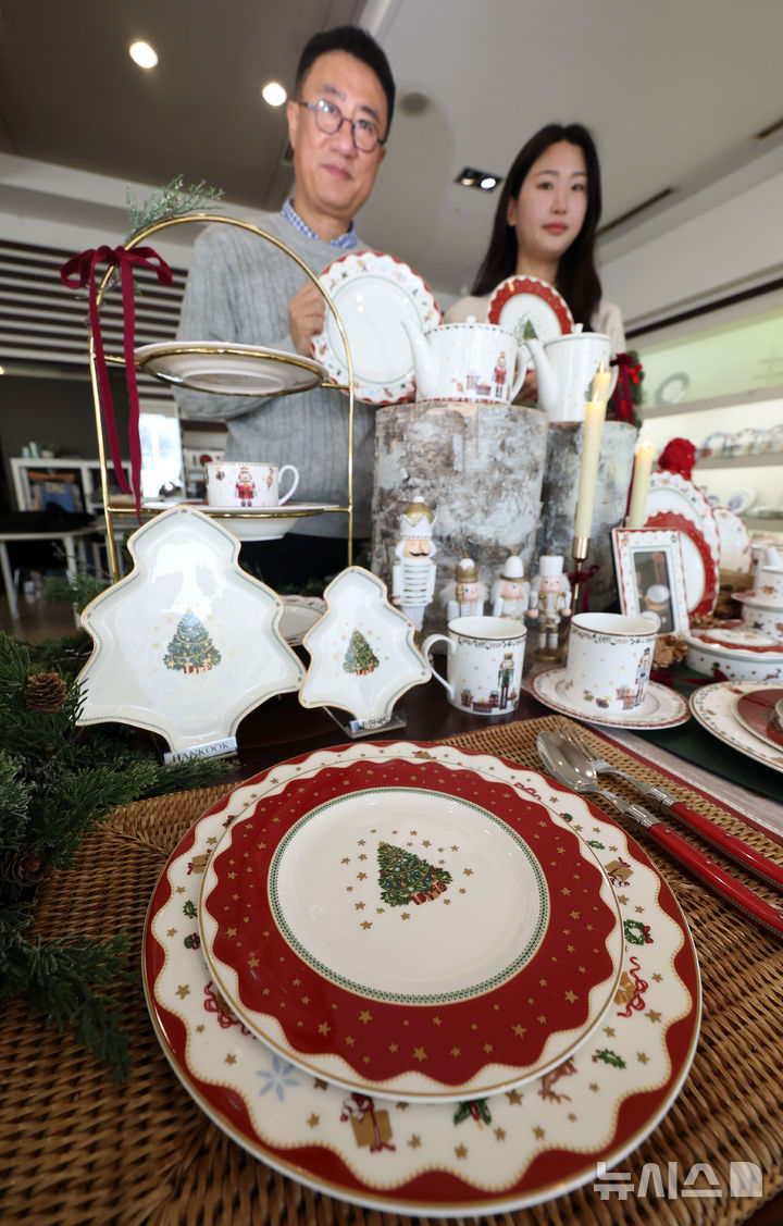 ソウル市東大門区の韓国陶磁器ビルで5日、イベントコンパニオンらがさまざまなデザインのクリスマス向け陶磁器のギフトセットを紹介した。