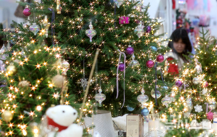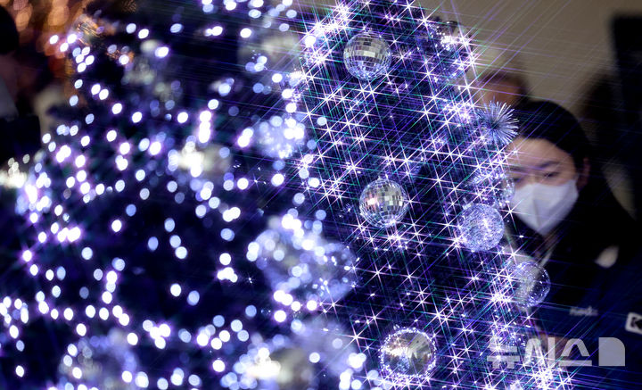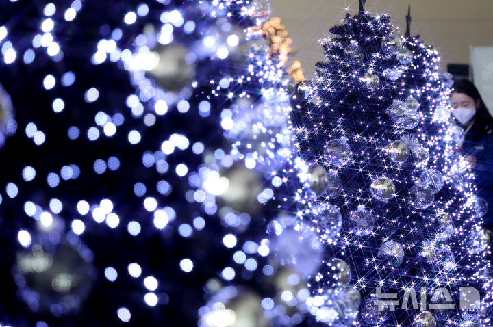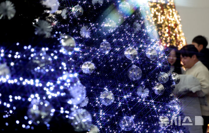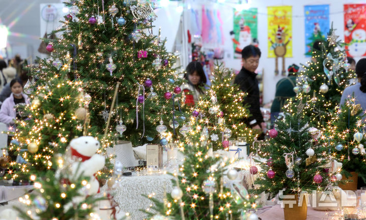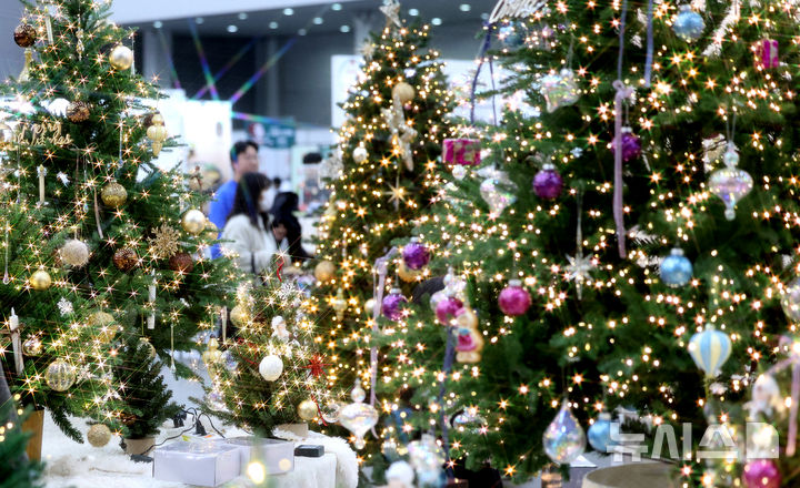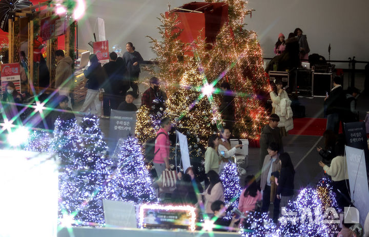 【NEWSIS】8日、大邱市北区のコンベンションセンター「EXCO」で行われている「2024大邱クリスマスフェア」を訪れ、クリスマスツリーやイルミネーションを見る人々。