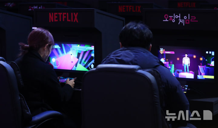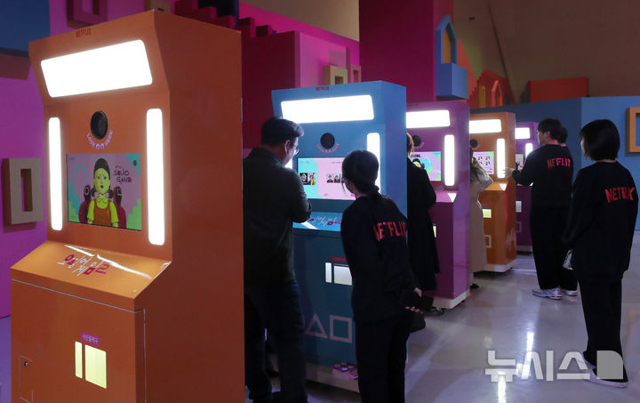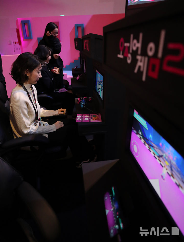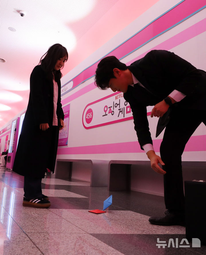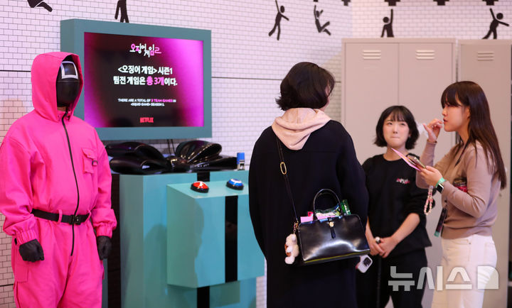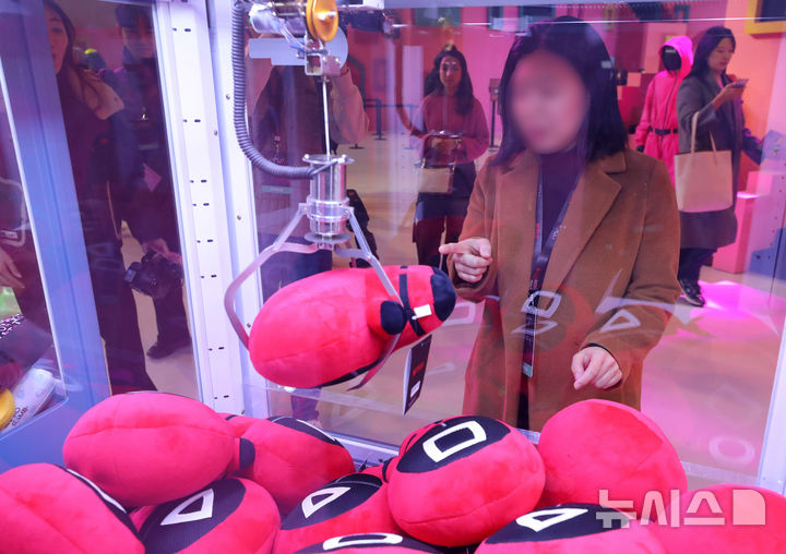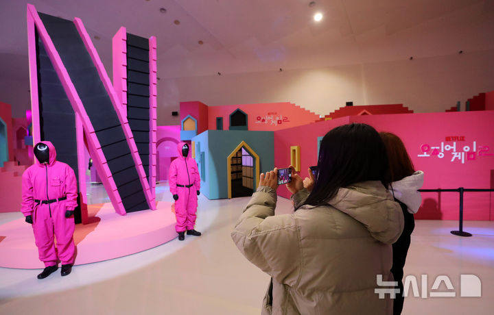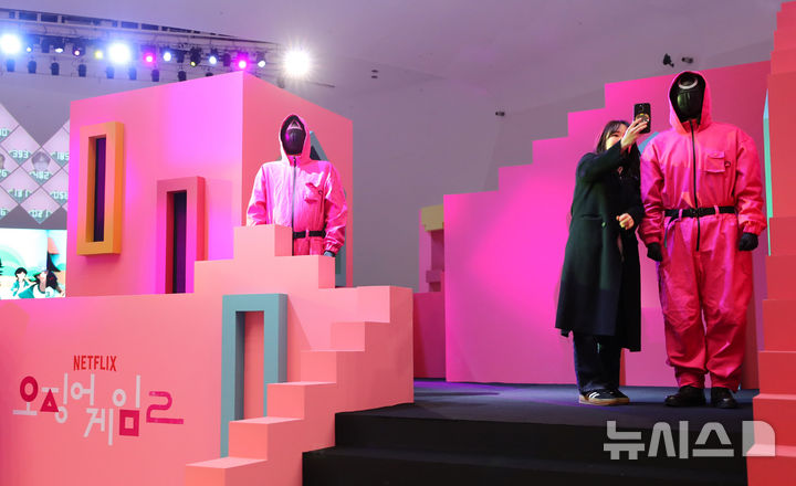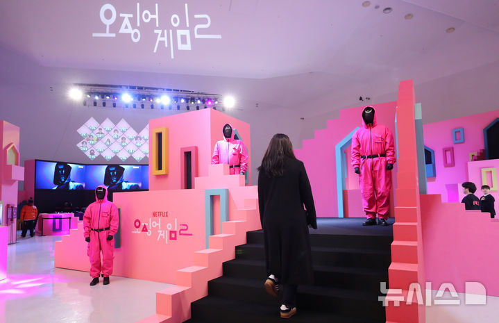 【NEWSIS】9日午前、ソウル市中区の東大門デザインプラザ(DDP)にNETFLIXシリーズ『イカゲーム』シーズン2の体験ゾーンがオープンした。写真は、会場にやって来たピンクソルジャー(の恰好をした関係者)の様子。
