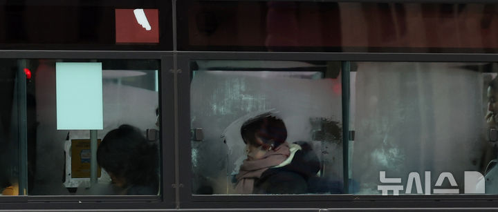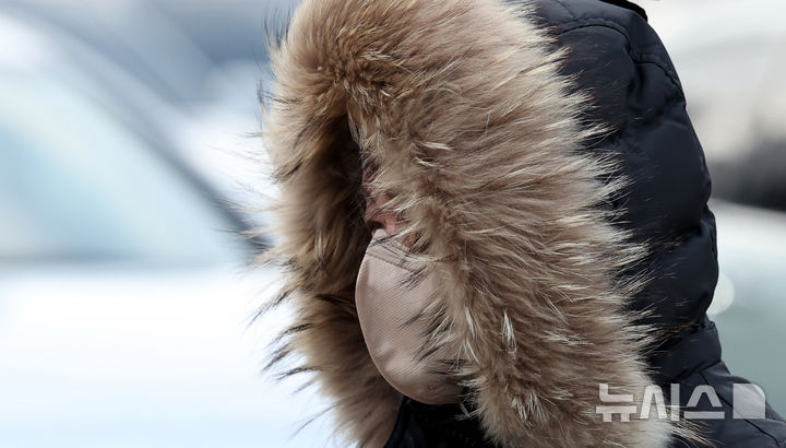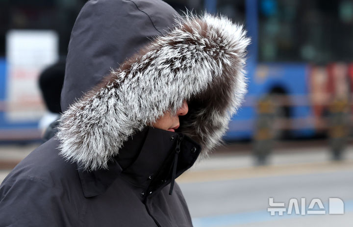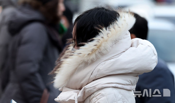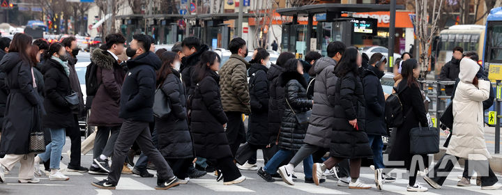 【NEWSIS】厳しい寒さとなった8日朝、ソウル市鍾路区の世宗大路交差点で、背中を丸めて足早に出勤する人々。