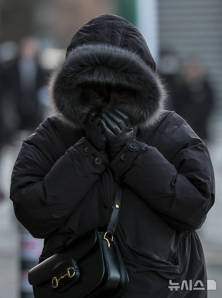 【NEWSIS】ソウルの最低気温が氷点下12℃を記録した9日、ソウル市竜山区の漢南大路近くを歩く人々。厚手のダウンジャケットを着て、フードをしっかりとかぶっていた。