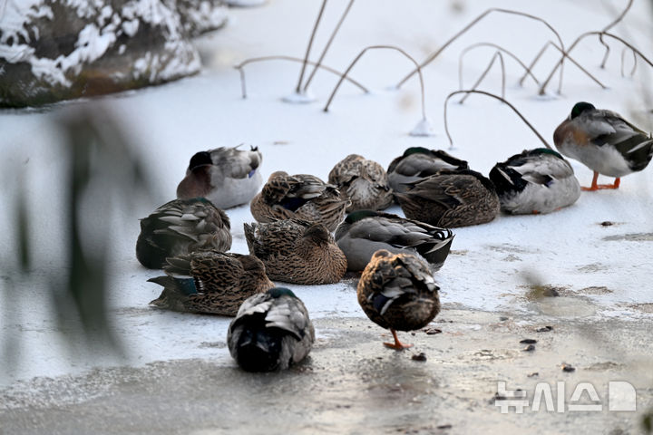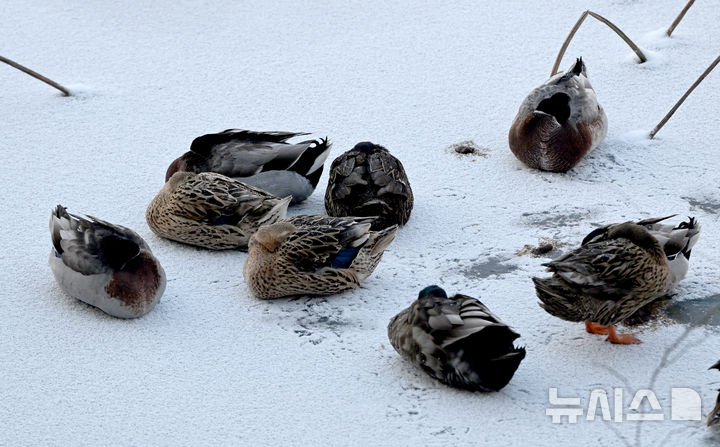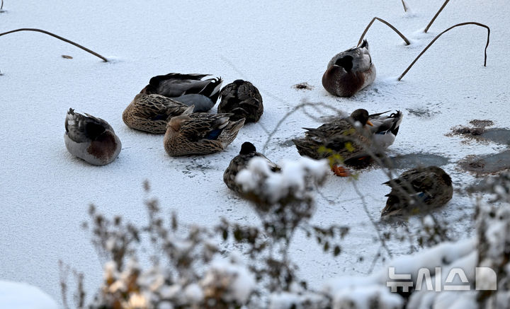 【NEWSIS】10日午前、雪が積もった光州市光山区のある大学キャンパス内の池は氷が張っていた。写真は凍った池の上でうずくまるカモの群れ。