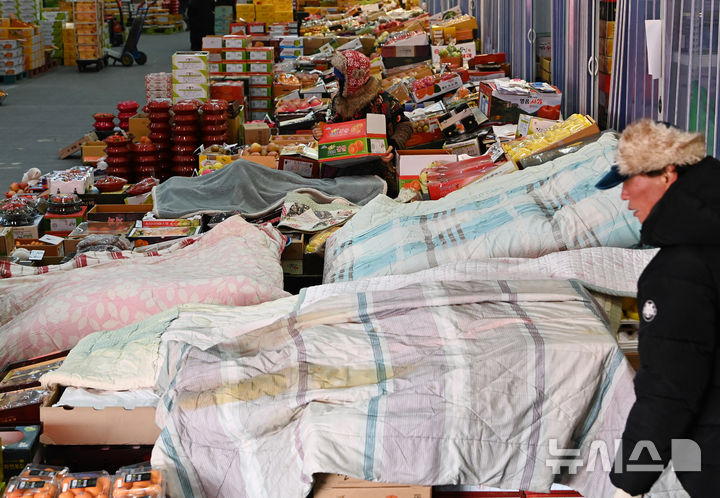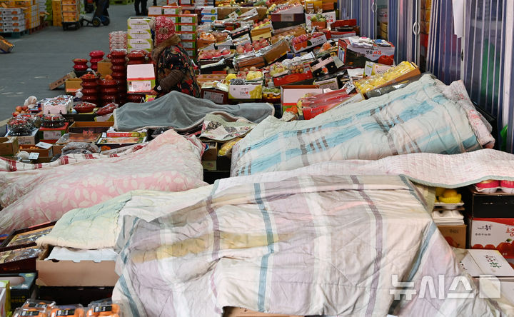 【NEWSIS】韓国各地に寒波警報が発令された10日、水原農水産物卸売市場(京畿道水原市勧善区)の果実棟では、凍結による破損を防止するため、保温用の毛布がかけられていた。