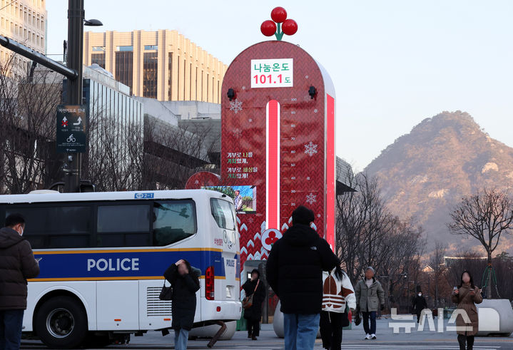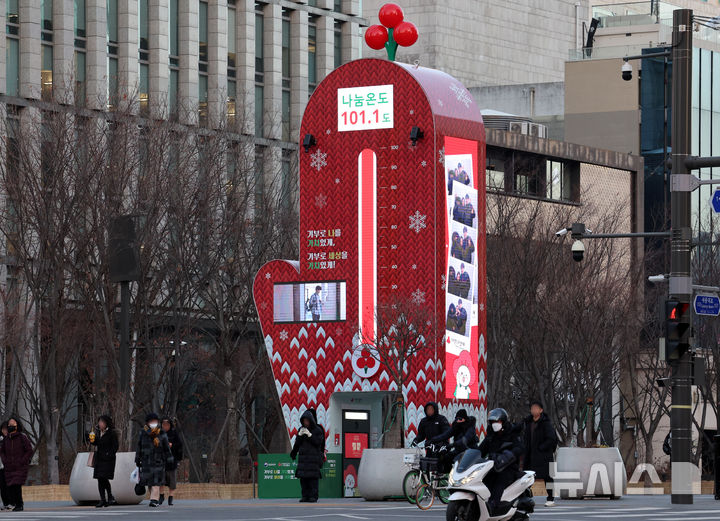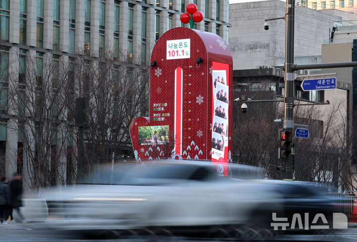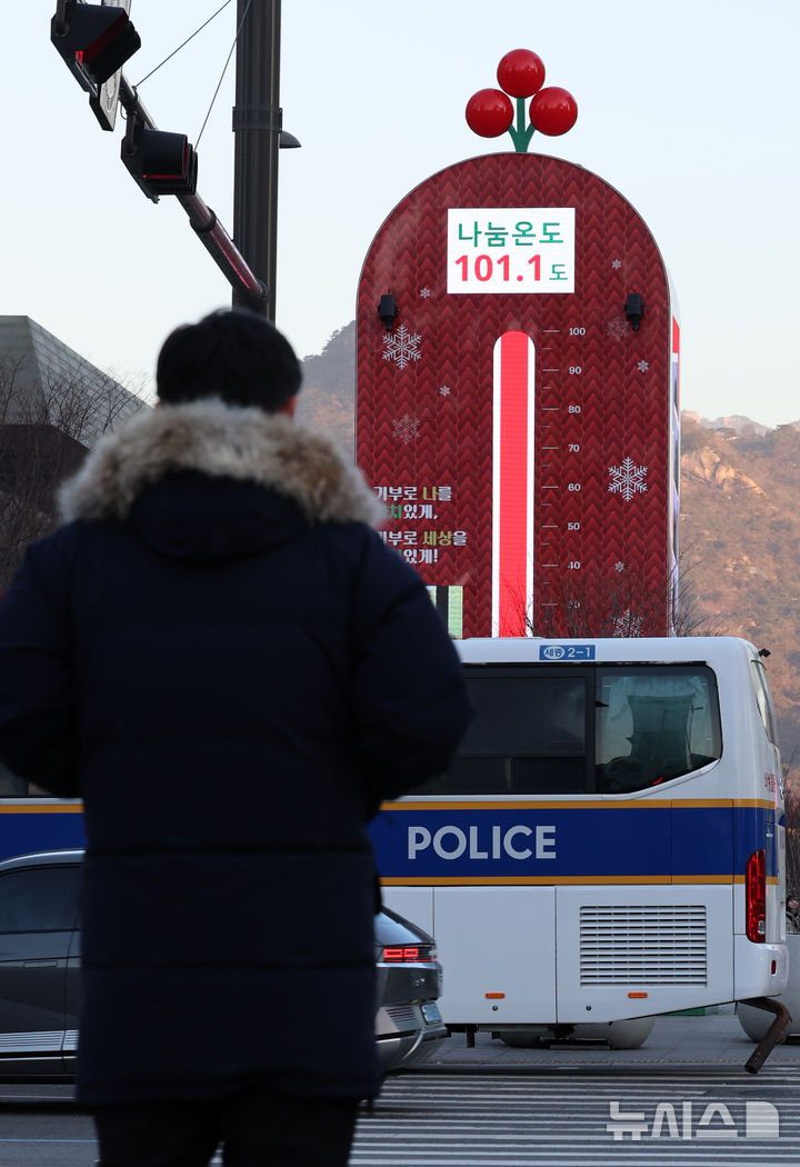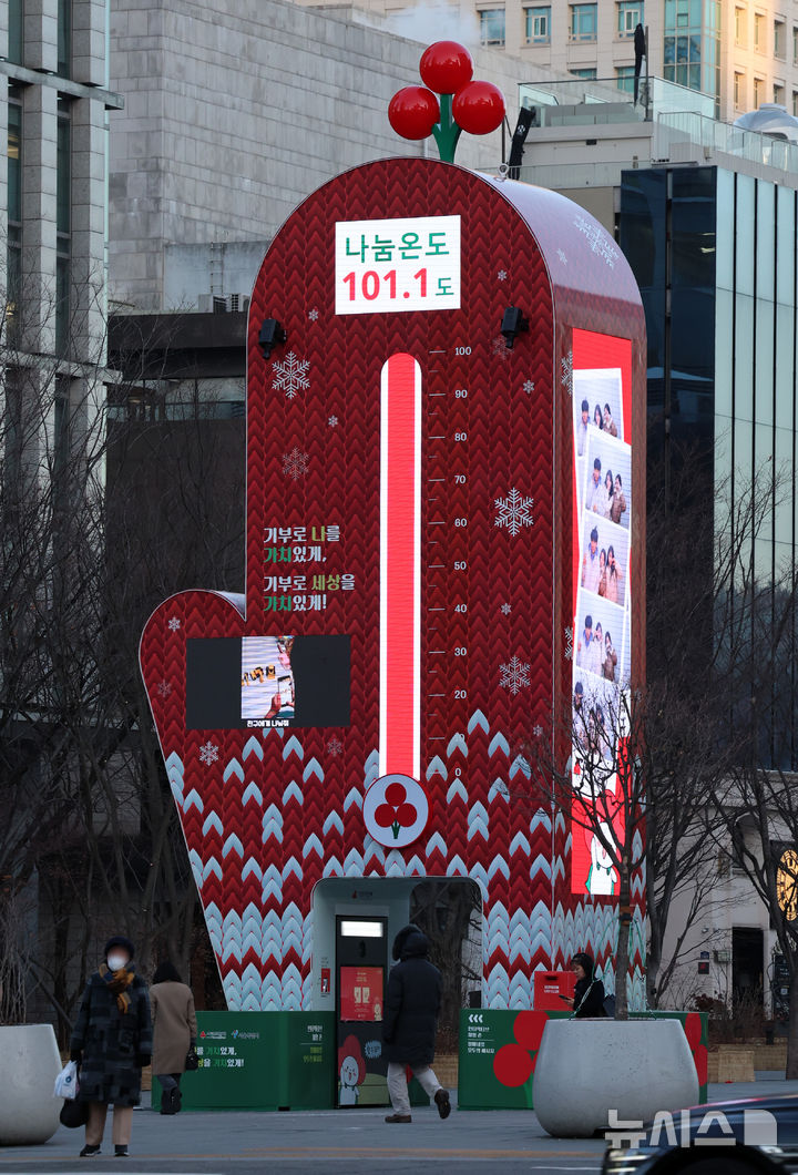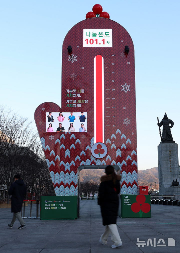【NEWSIS】15日午前、ソウル市鍾路区の光化門広場に設置された「愛の温度塔」。「助け合い温度」が101.1℃と表示されている。愛の温度塔は募金目標額を「助け合い温度=100℃」とするもので、100℃を超えたということは目標額を達成したという意味だ。