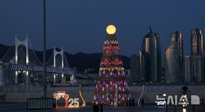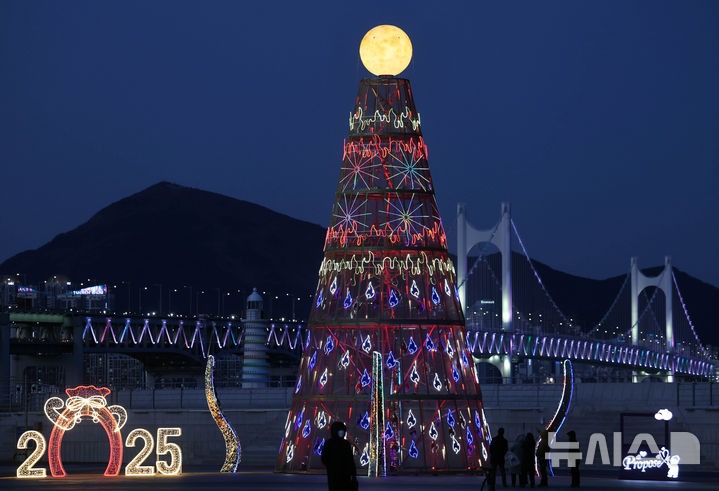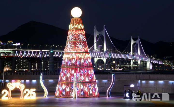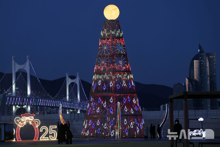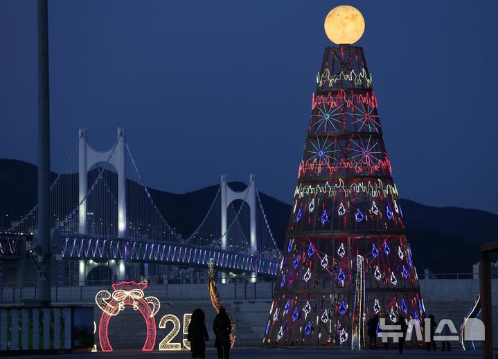 【NEWSIS】5日、釜山市南区の竜湖ピョルビッ(星明かり)公園に設置された高さ17.5メートルの「LEDタルジプ」に明かりがともった。「タルジプ」は日本の「どんど焼き」に当たる。