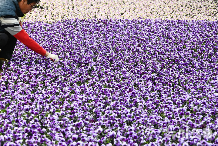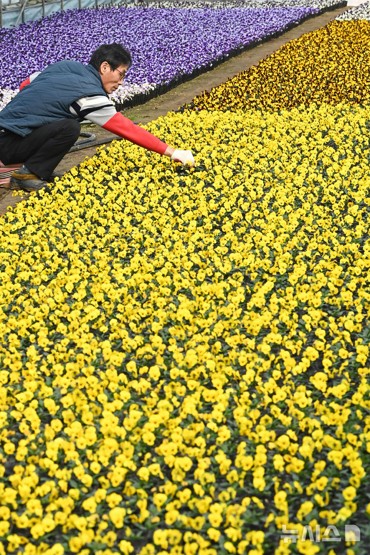 【NEWSIS】京畿道華城市梅松面で10日、農園のビニールハウスで、出荷が近いパンジーの花を関係者が抜き出している様子。