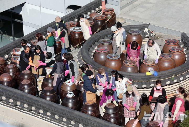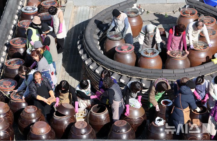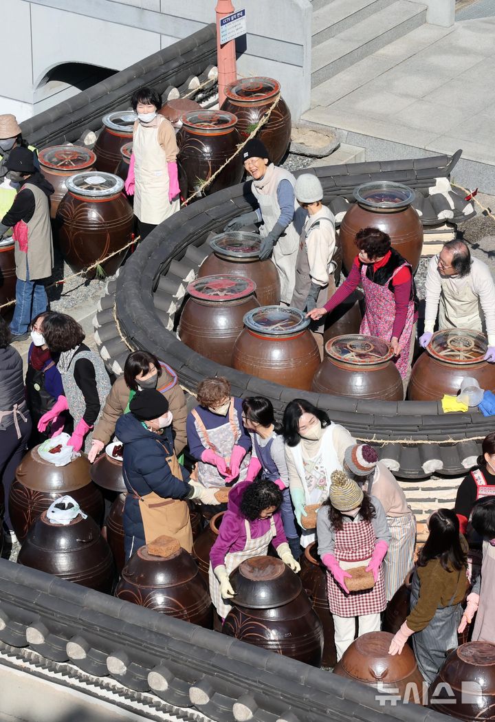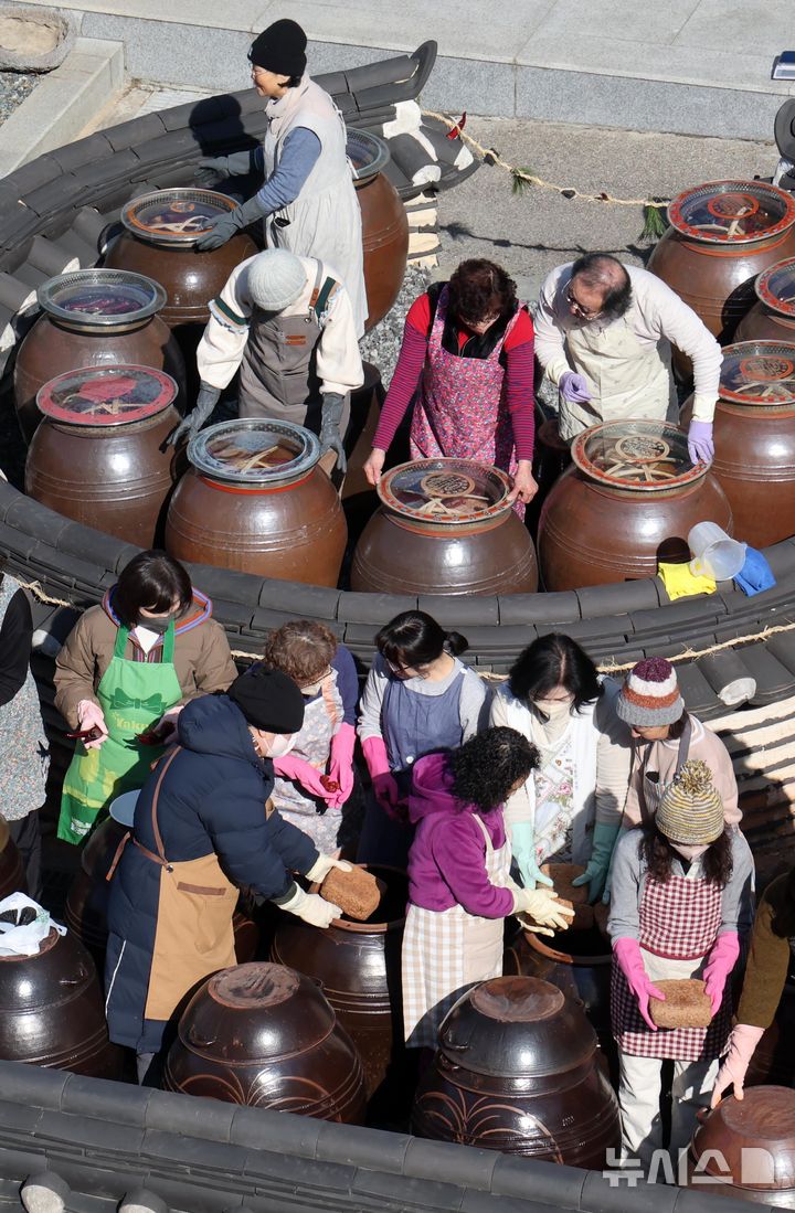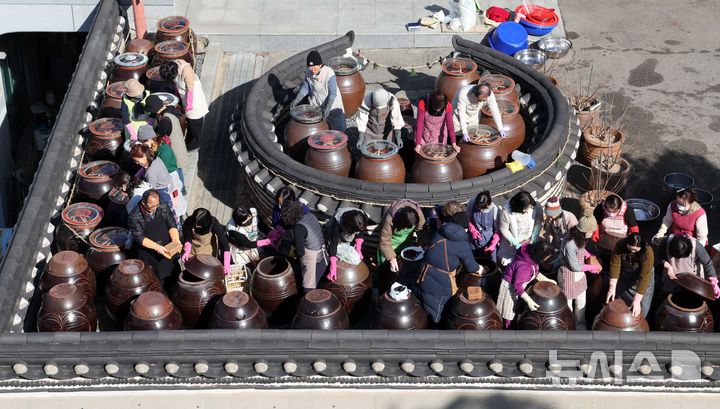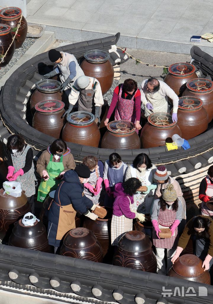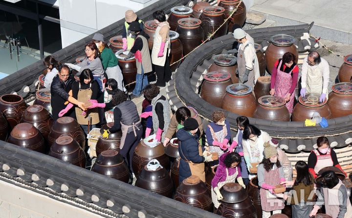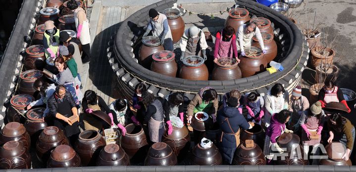 【NEWSIS】釜山市機張郡の機張郡農業技術センターで11日、地域の主婦などが伝統の「ジャン」作り法を学んでいる様子。
