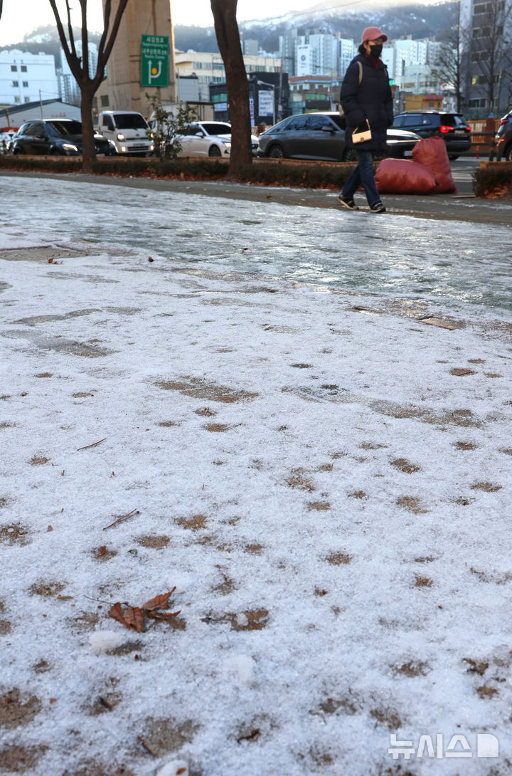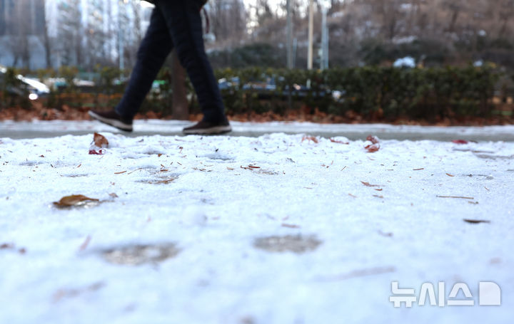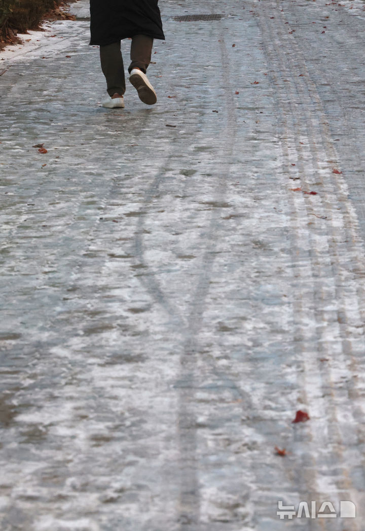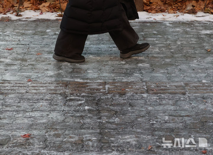 【NEWSIS】13日午前、ソウル市西大門区で、凍結した道を避け、転ばないように慎重に歩く人。