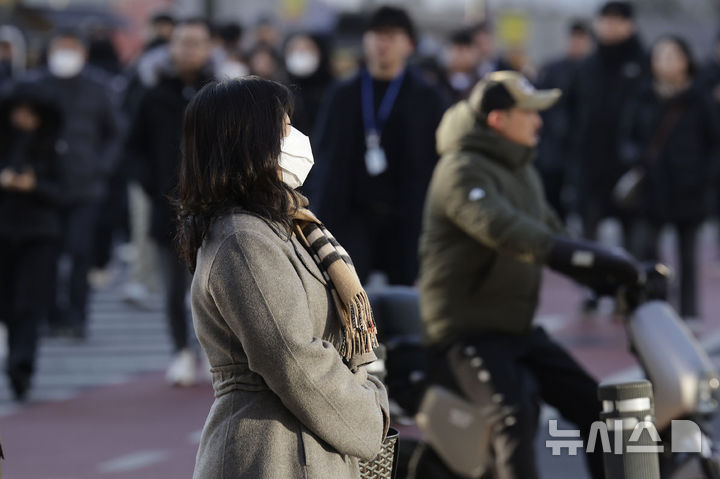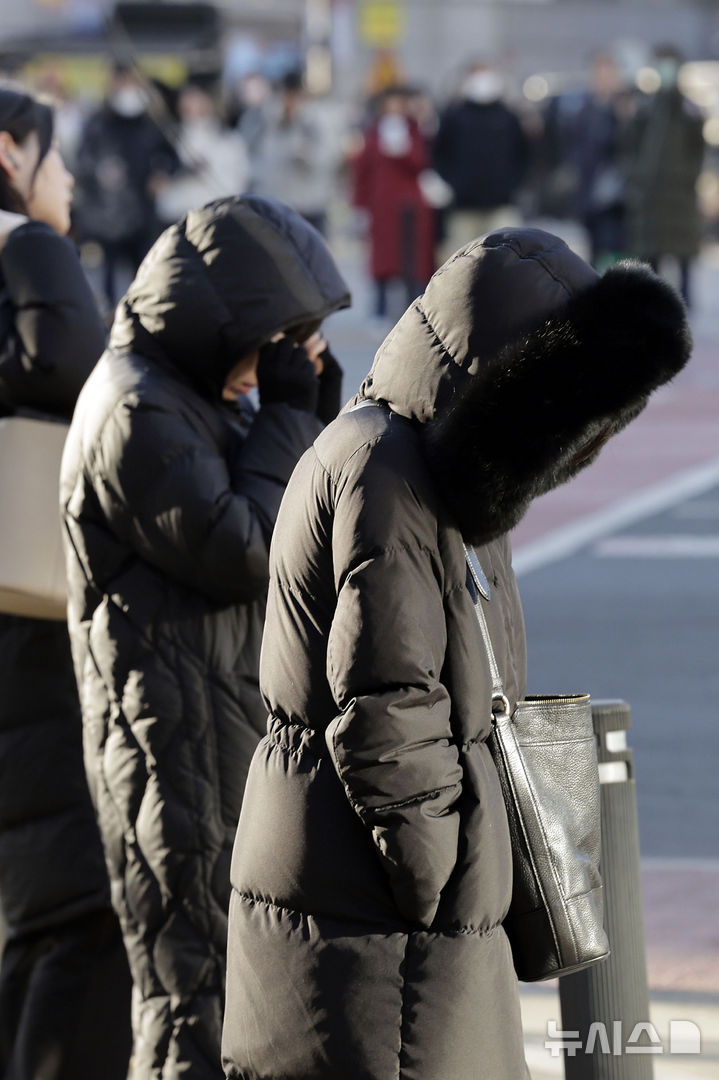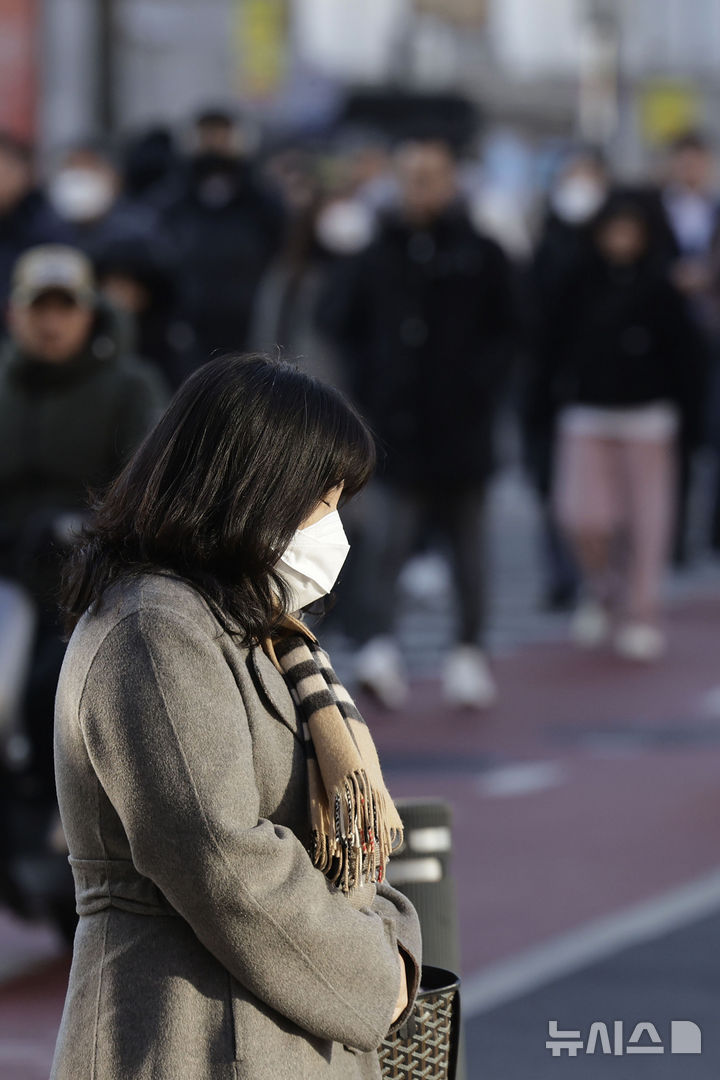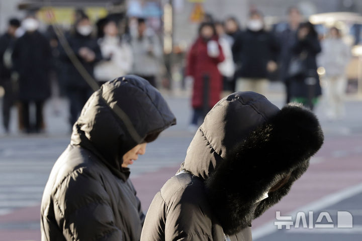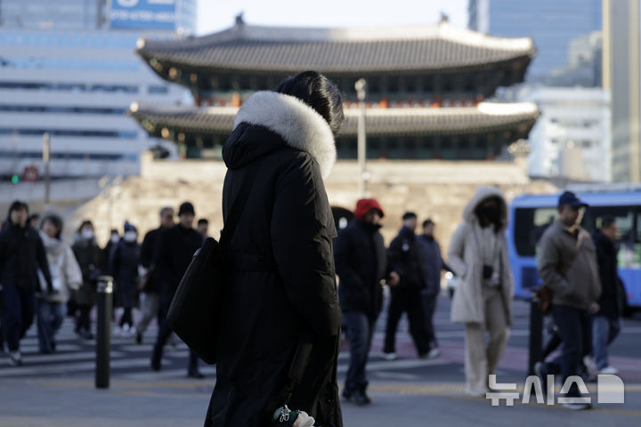 【NEWSIS】平年より低い気温が続いている24日午前、ソウル・崇礼門(南大門)近くを出勤のため歩く人々。韓国気象庁では25日から平年並みの気温になると予報している。