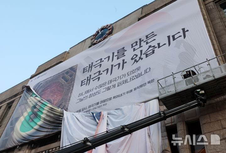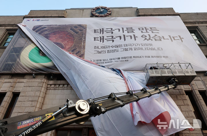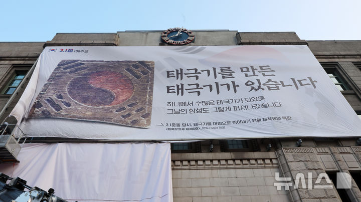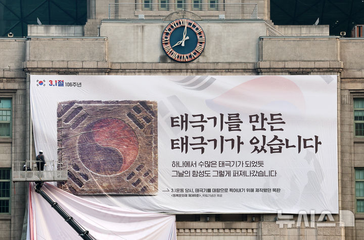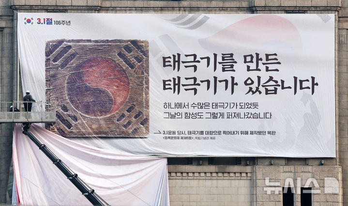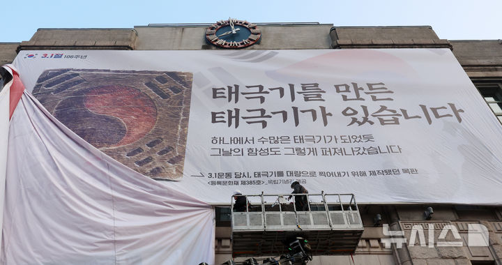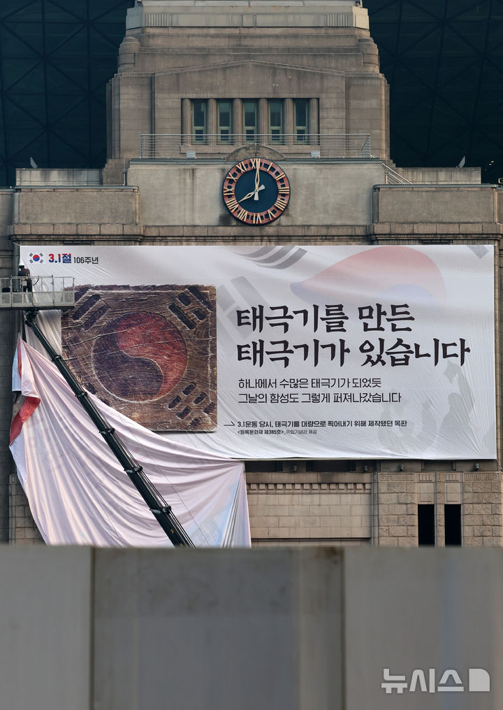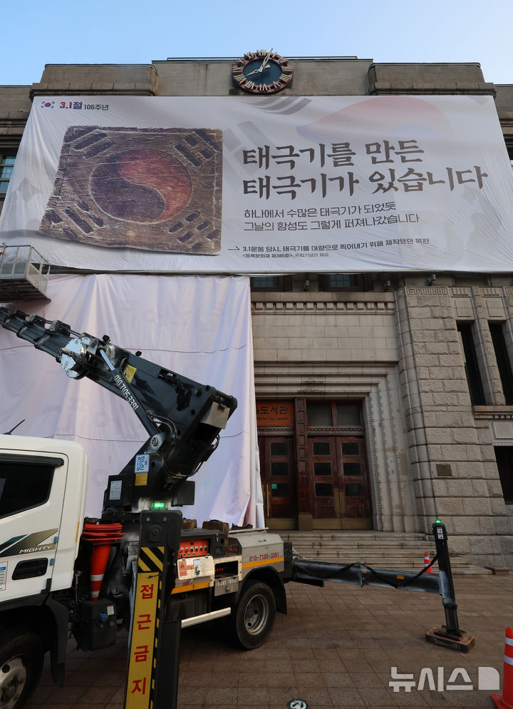 【NEWSIS】「三一節」106周年まであと三日となった26日午前、ソウル市中区にあるソウル図書館の外壁「夢の刻版」では横断幕が新たに掲げられた。三一節は1919年3月1日の三一独立運動を記念する日だ。