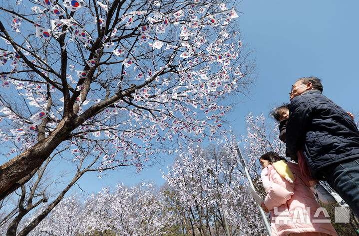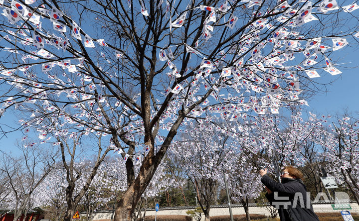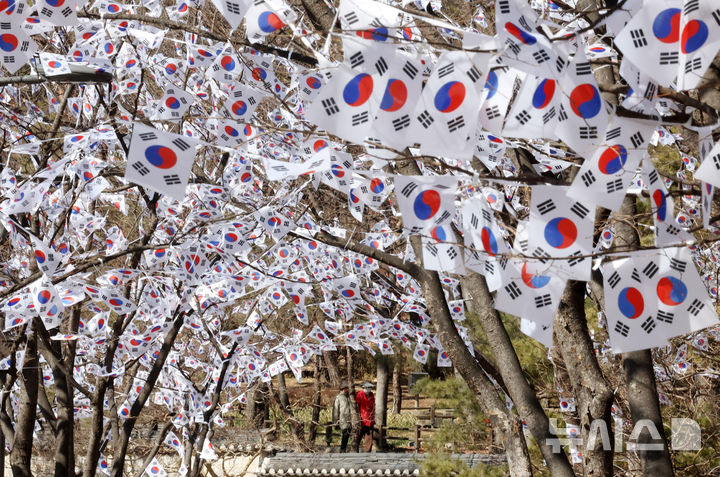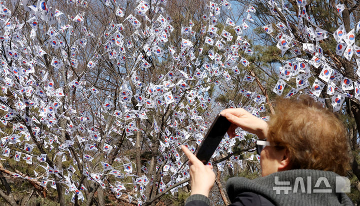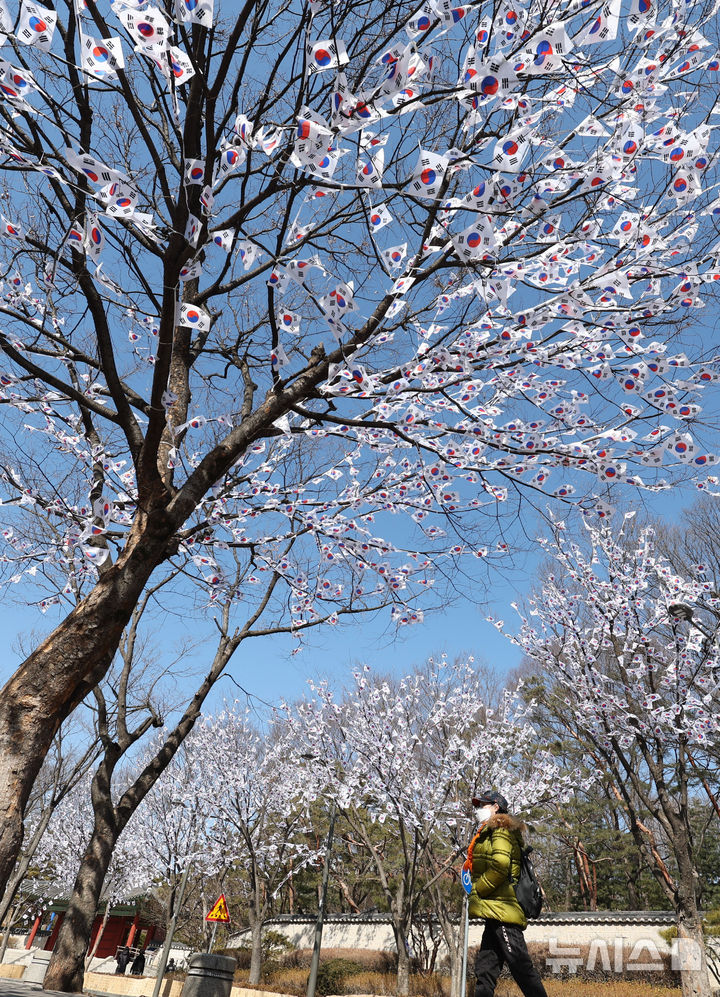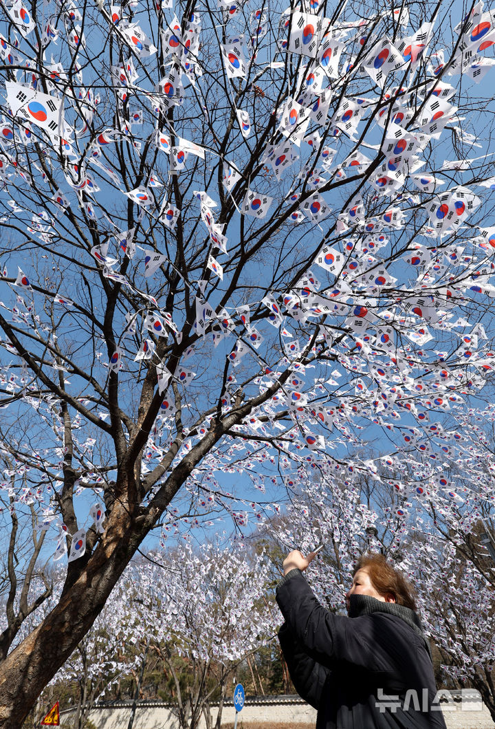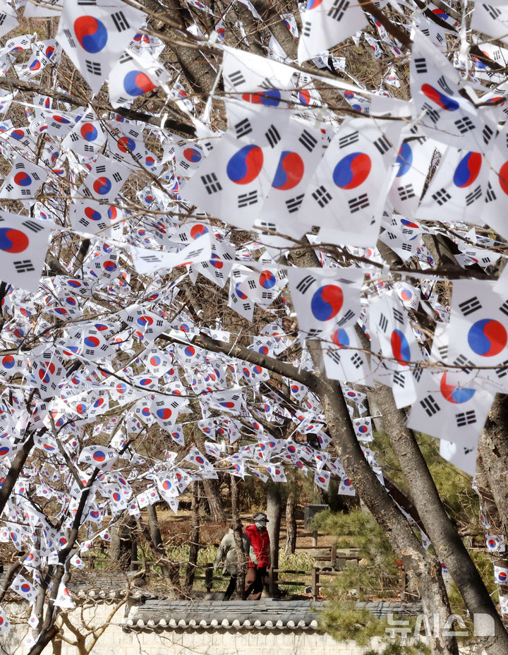 【NEWSIS】三・一節まであと三日と迫った26日午後、ソウル市竜山区の孝昌公園に造成された「太極旗通り」の様子。