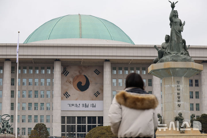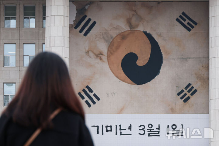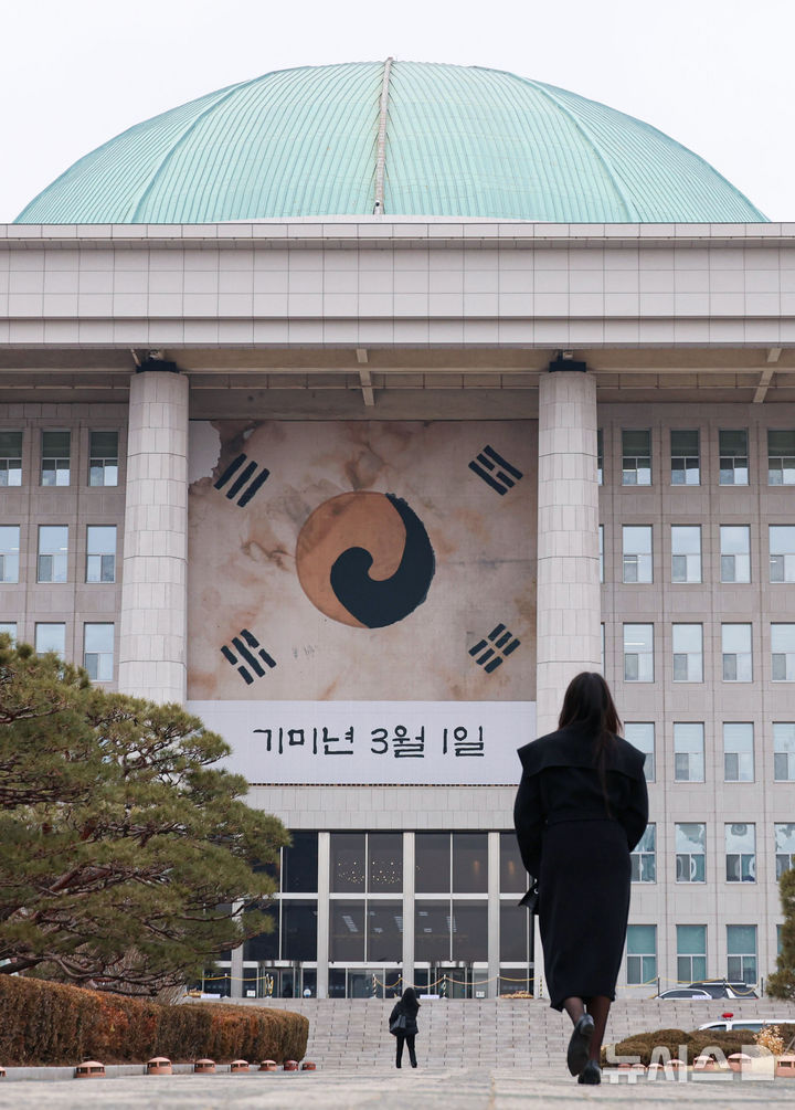 【NEWSIS】三一節の前日に当たる28日午前、ソウル・汝矣島の韓国国会議事堂に三一節を告げる「津寬寺太極旗」の横断幕が設置された。三一節は1919年3月1日の三一独立運動を記念する日で、「津寬寺太極旗」は同年ごろに制作されたと推定される太極旗だ。2009年にソウルの津寬寺で発見された。