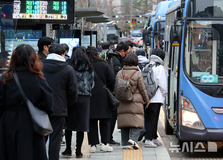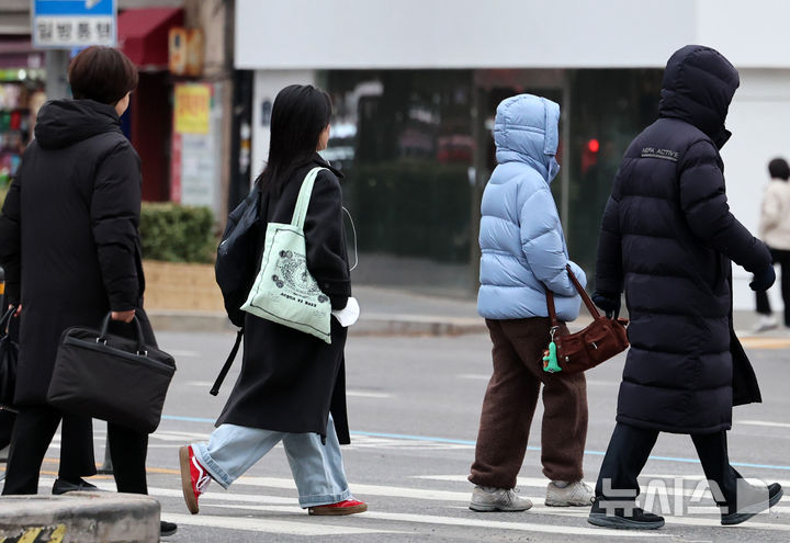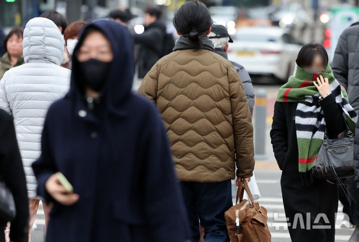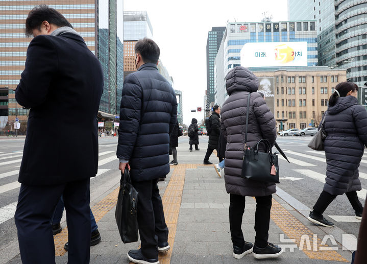 【NEWSIS】寒さがぶり返した4日午前、ソウル市鍾路区の光化門交差点で、厚手のコートを着て足早に歩く人々。