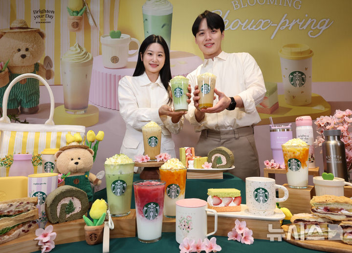 【NEWSIS】スターバックス・コリアでは4日、ソウル市竜山区のスターバックス・ソウル駅アカデミー店で、新メニュー「シュークリーム抹茶ラテ」と「シュークリーム・ラテ」発売をPRした。
