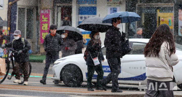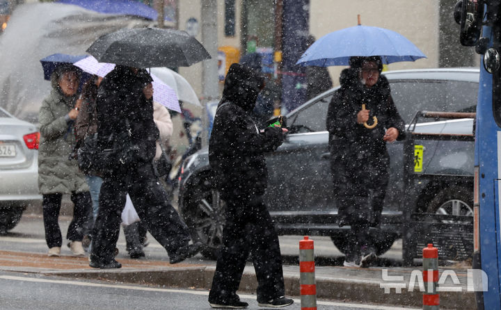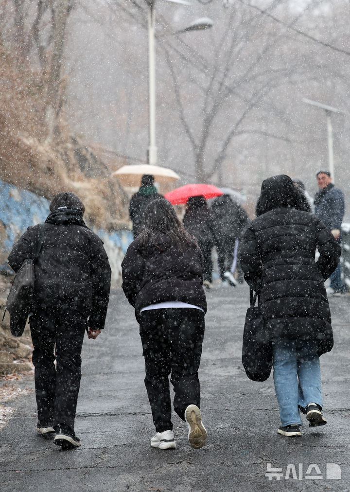 【NEWSIS】雪が降った4日午前、ソウル市西大門区のソウルメトロ3号線・弘済駅近くで、傘をさして歩く人。