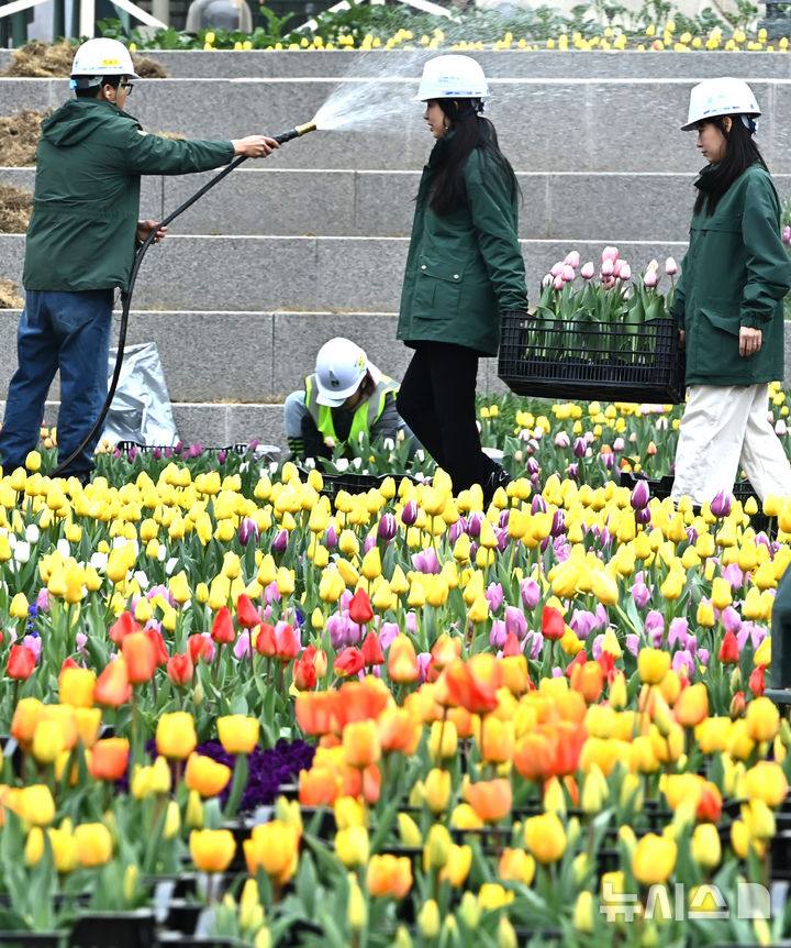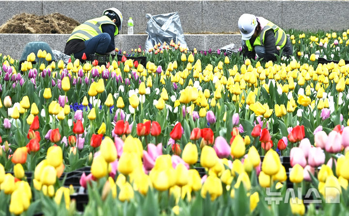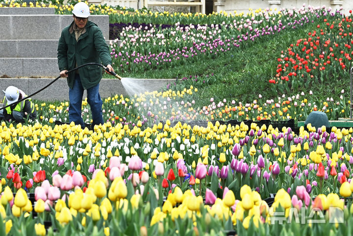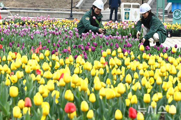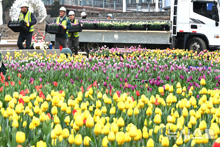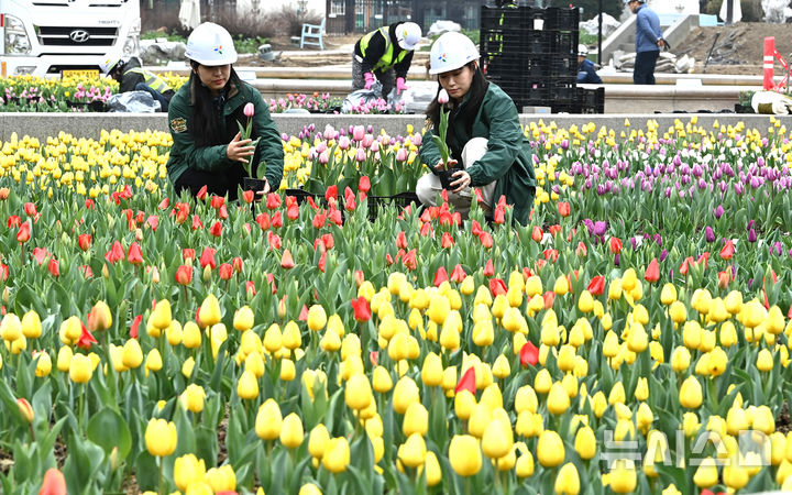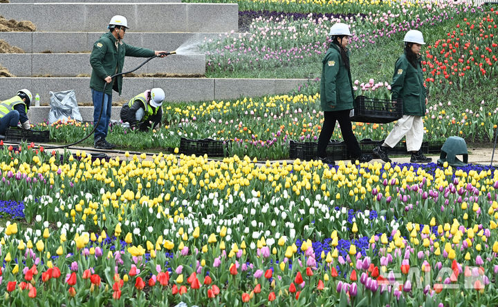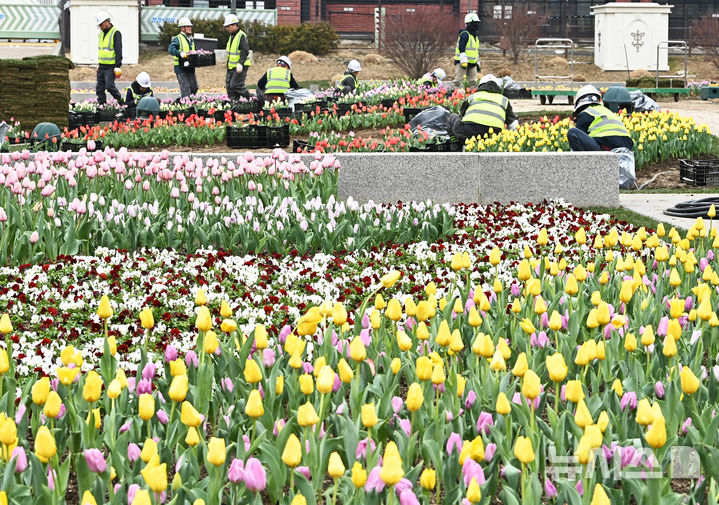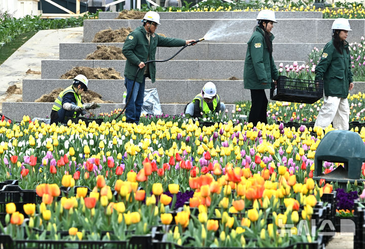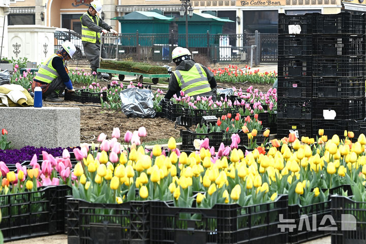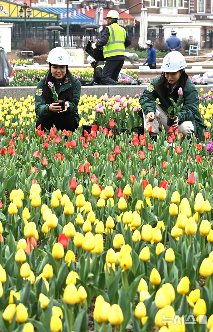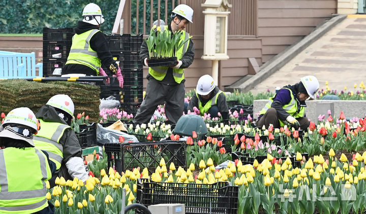 【NEWSIS】エバーランドのチューリップ祭り開催が間近に迫った12日、京畿道竜仁市のエバーランド・フォーシーズンズ・ガーデンでは、関係者がチューリップの移植作業などで忙しく動き回っていた。今回の祭典は、チューリップやスイセンなどおよそ100種類、120万輪のさわやかな春の花々と共にきたる21日に開幕する。