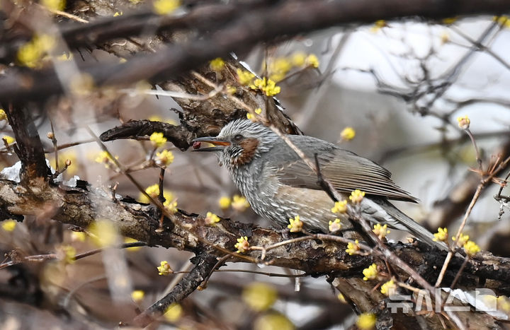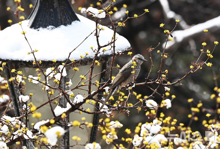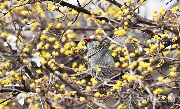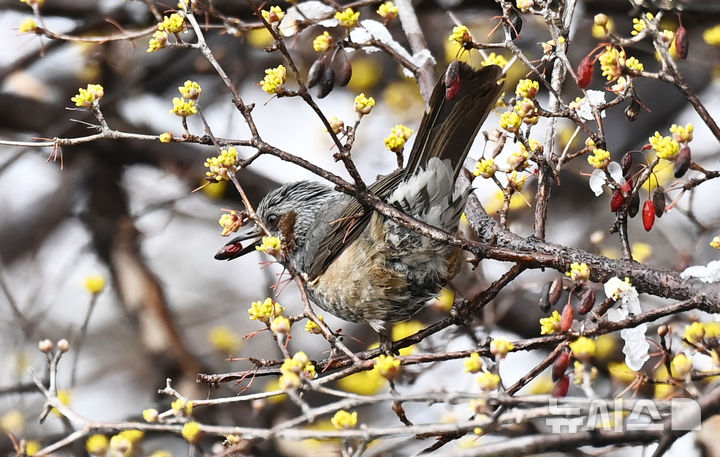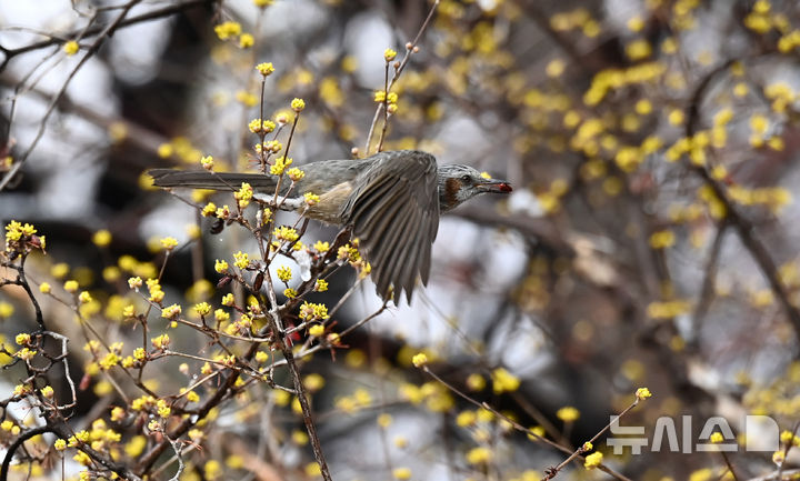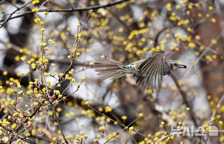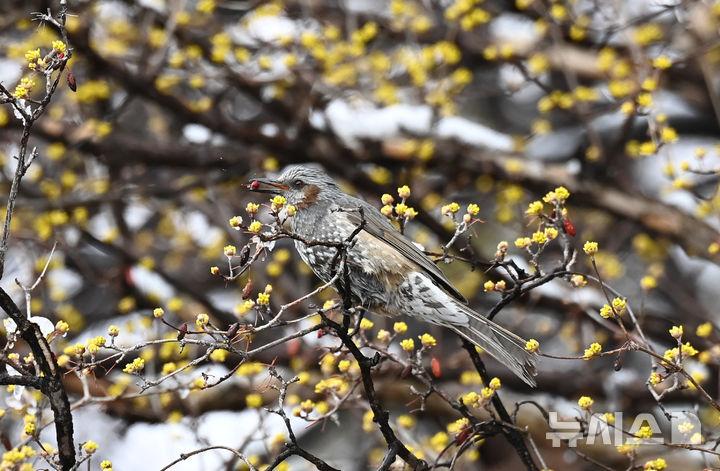 【NEWSIS】大雪警報が発令された18日、京畿道水原市の八達山で、サンシュユの実を咥えて飛ぶヒヨドリの様子。