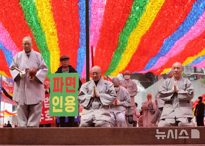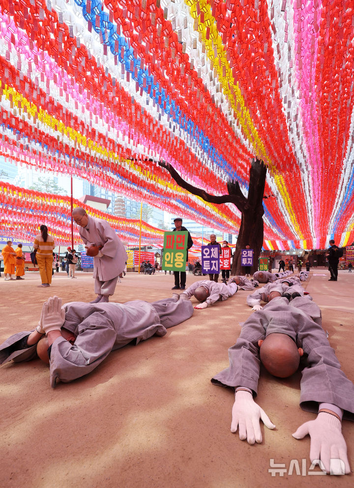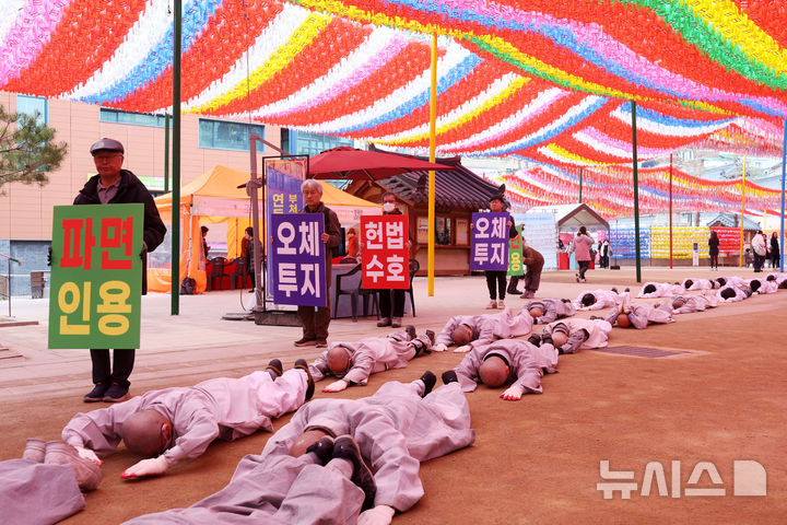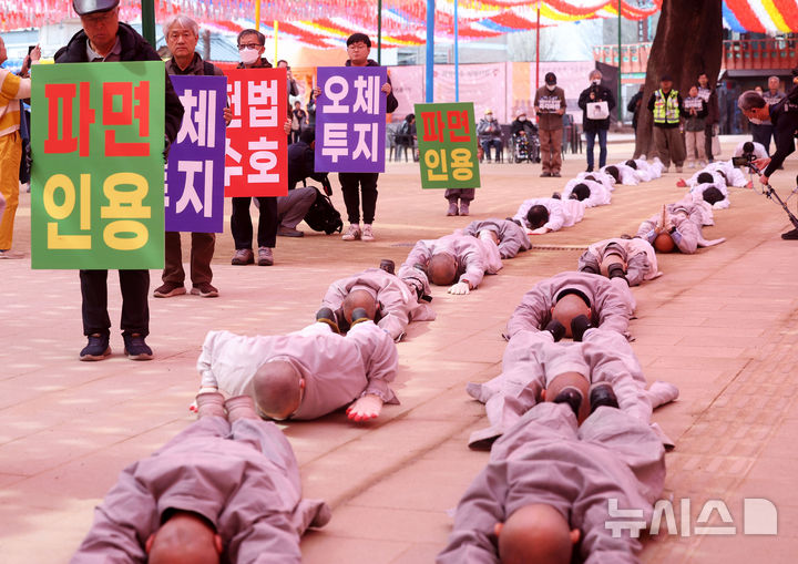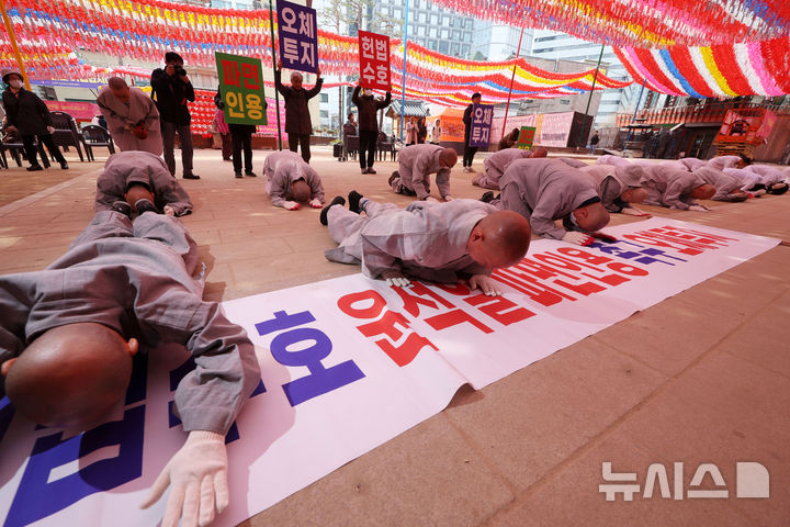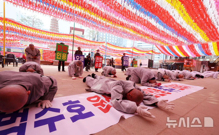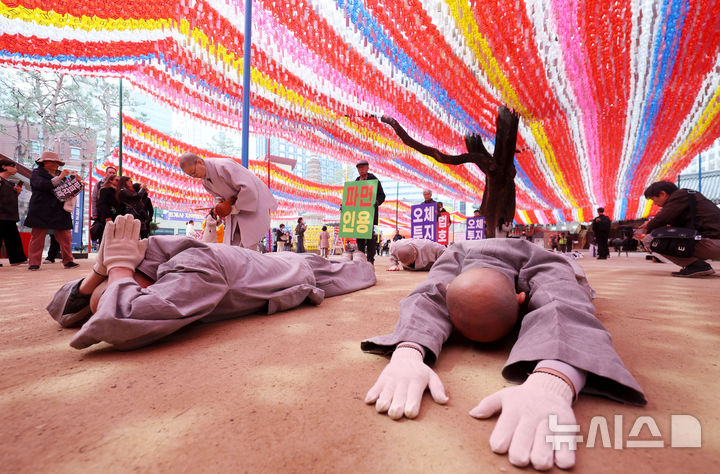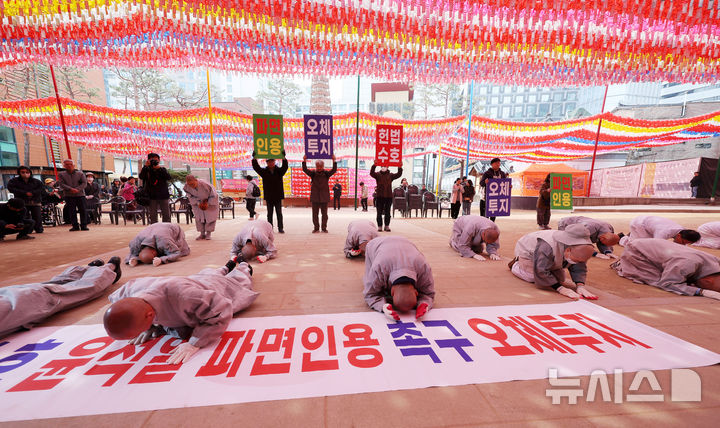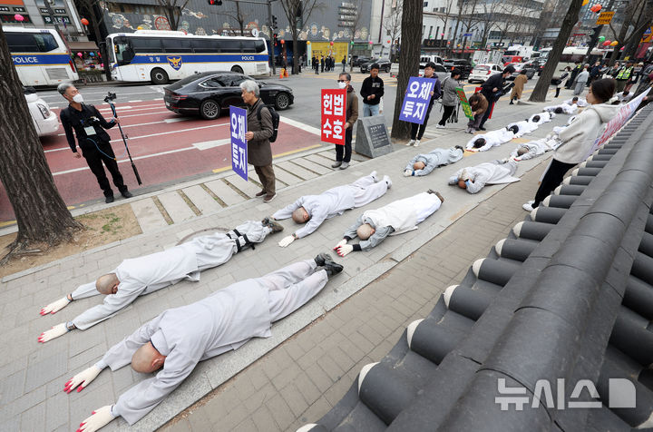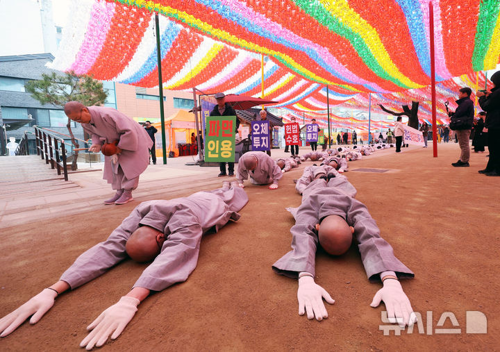【NEWSIS】大韓仏教曹渓宗社会労働委員会・汎(版)仏教時局会議の僧侶たちが2日、ソウル市鍾路区の曹渓寺で、尹錫悦(ユン・ソンニョル)大統領の罷免と弾劾認容を求めて憲法裁判所に向けて五体投地を行っている様子。