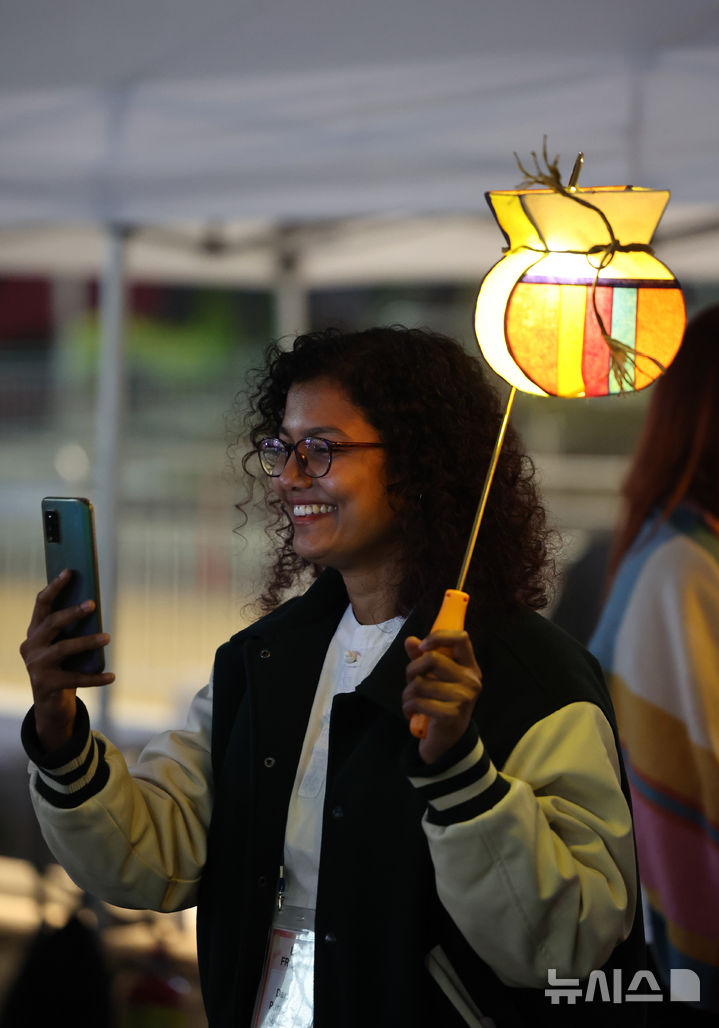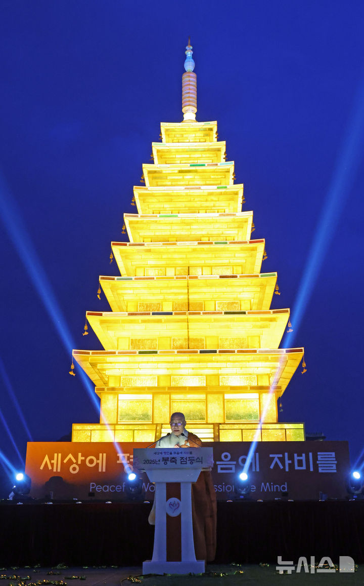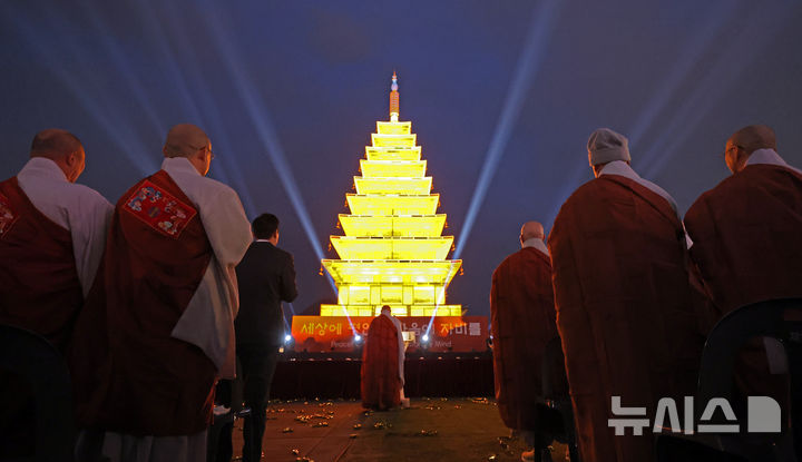 【NEWSIS】2日午後、ソウル市鍾路区の光化門広場で開かれた奉祝点灯式で、益山・弥勒寺址石塔を模したお祝い用のランタン(祝灯)が点灯された。