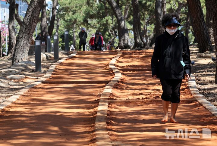 【NEWSIS】7日、釜山市海雲台区の海雲台海水浴場松林公園に造成された「海雲台の海の黄土道」を訪れた市民が、裸足での歩行を楽しんでいる様子。