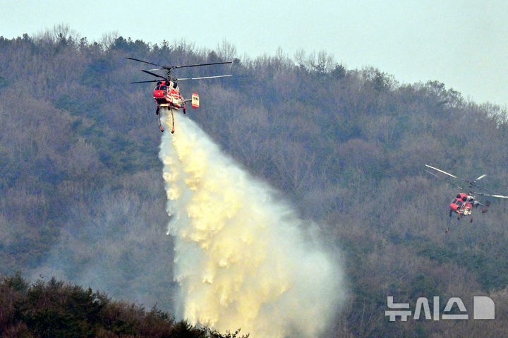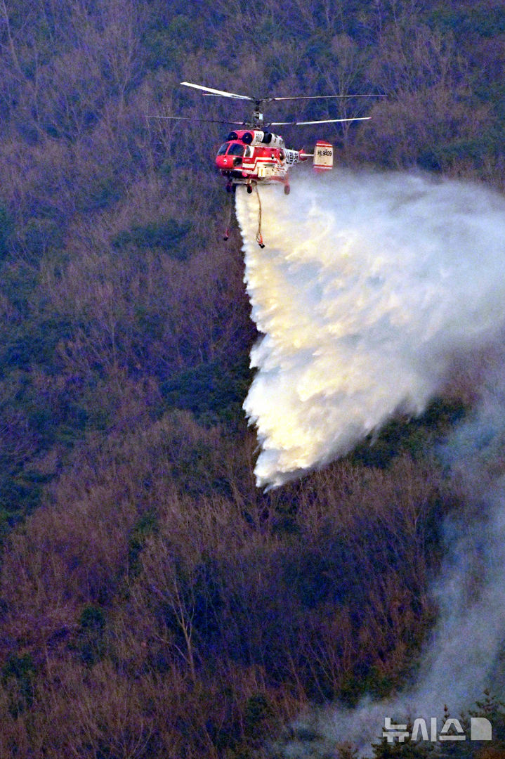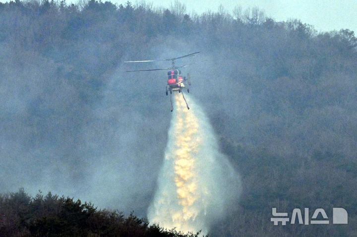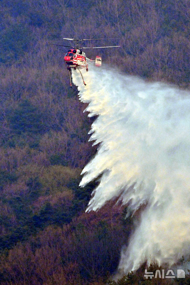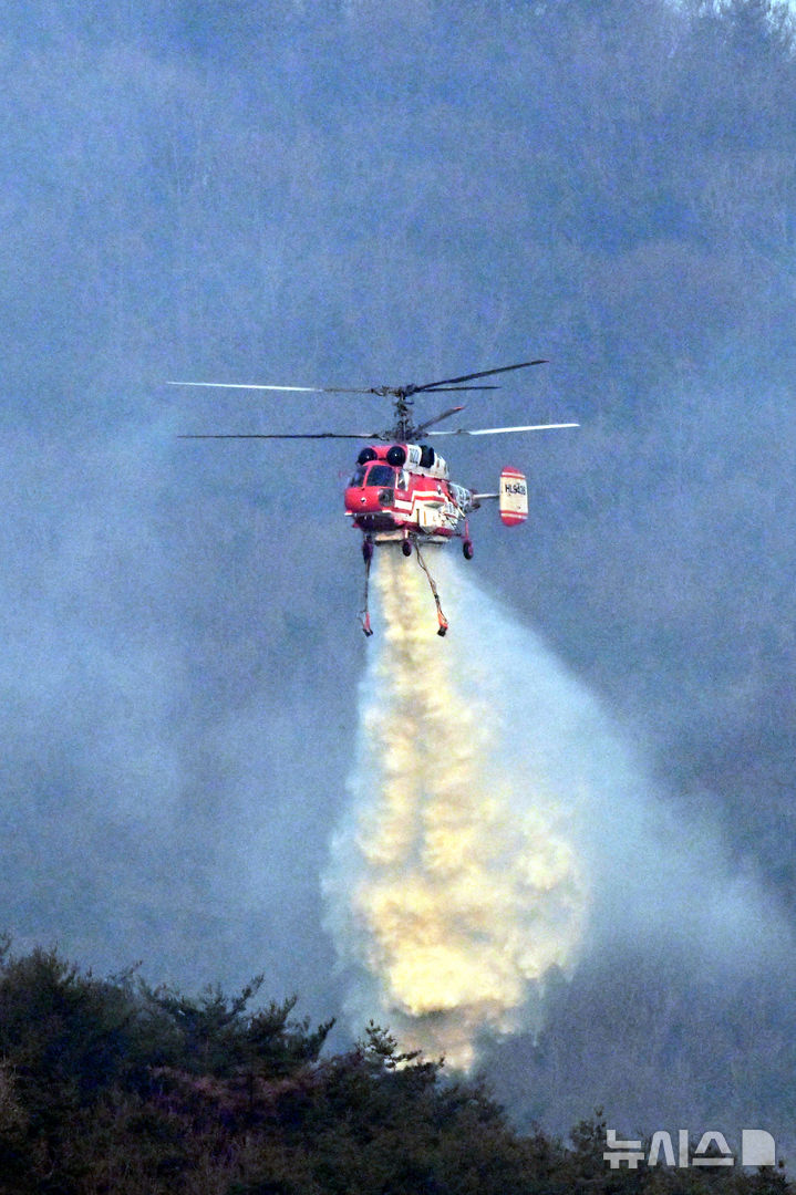 【NEWSIS】慶尚南道河東郡で山火事が発生して二日目を迎えた8日午前、鎮圧活動をするヘリコプター。