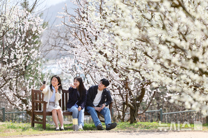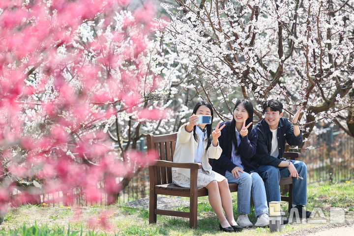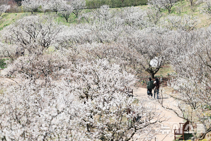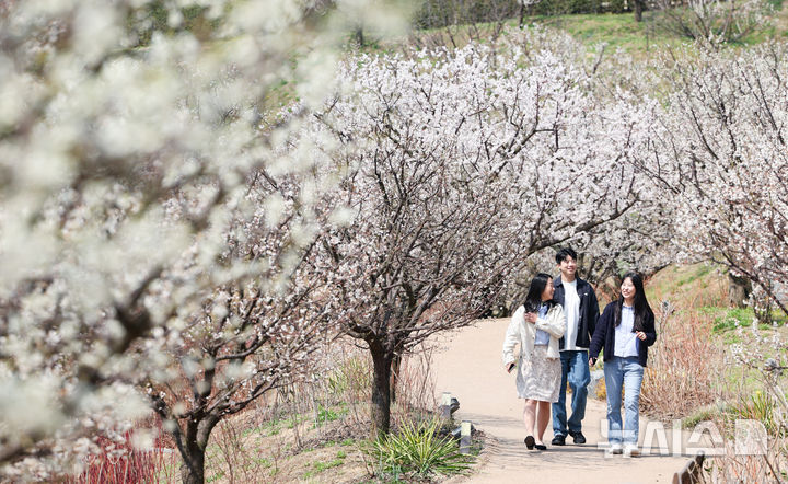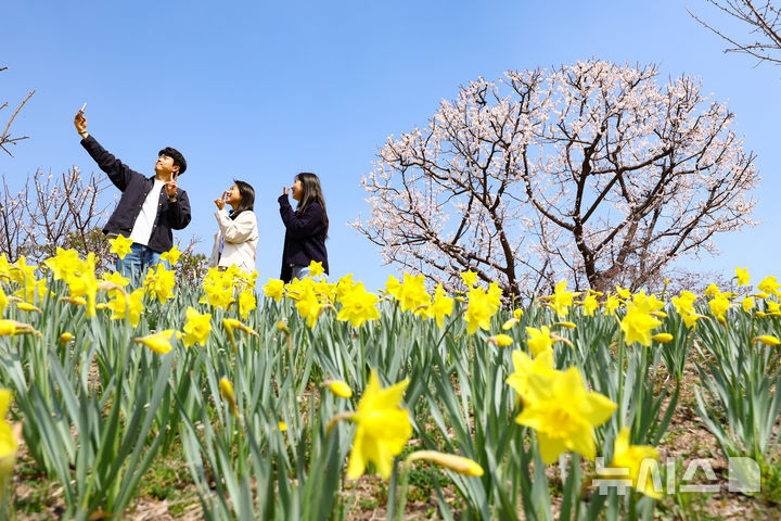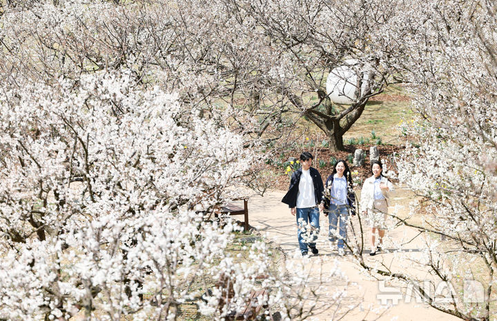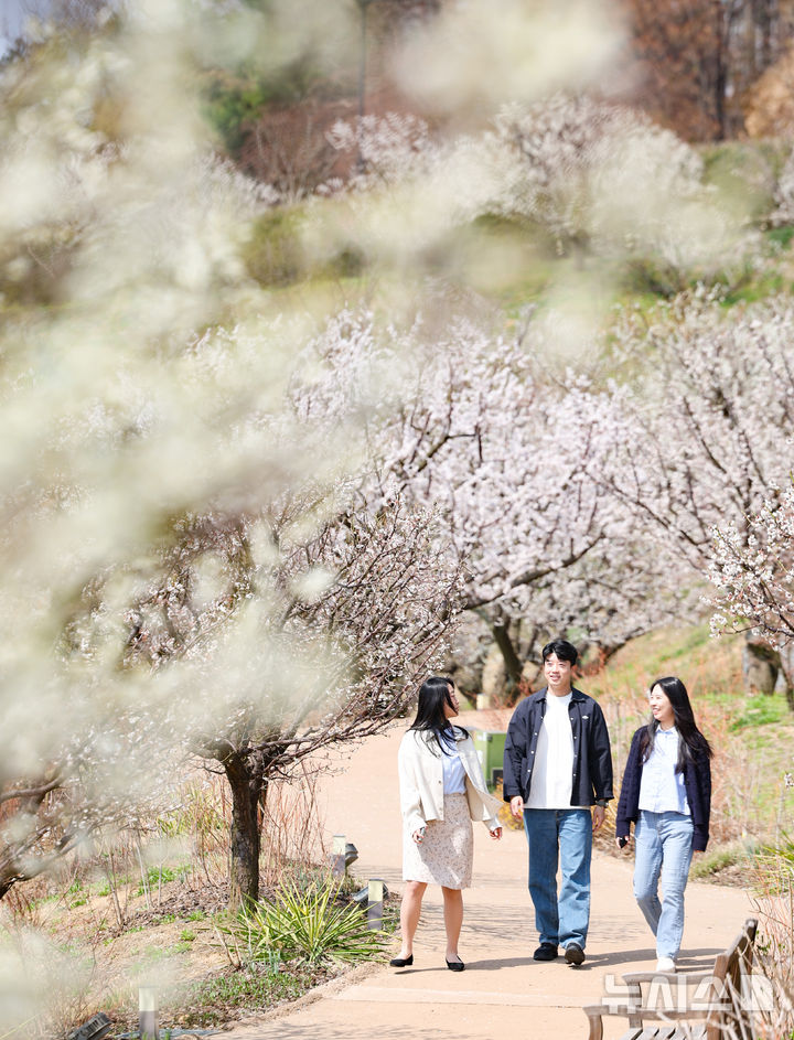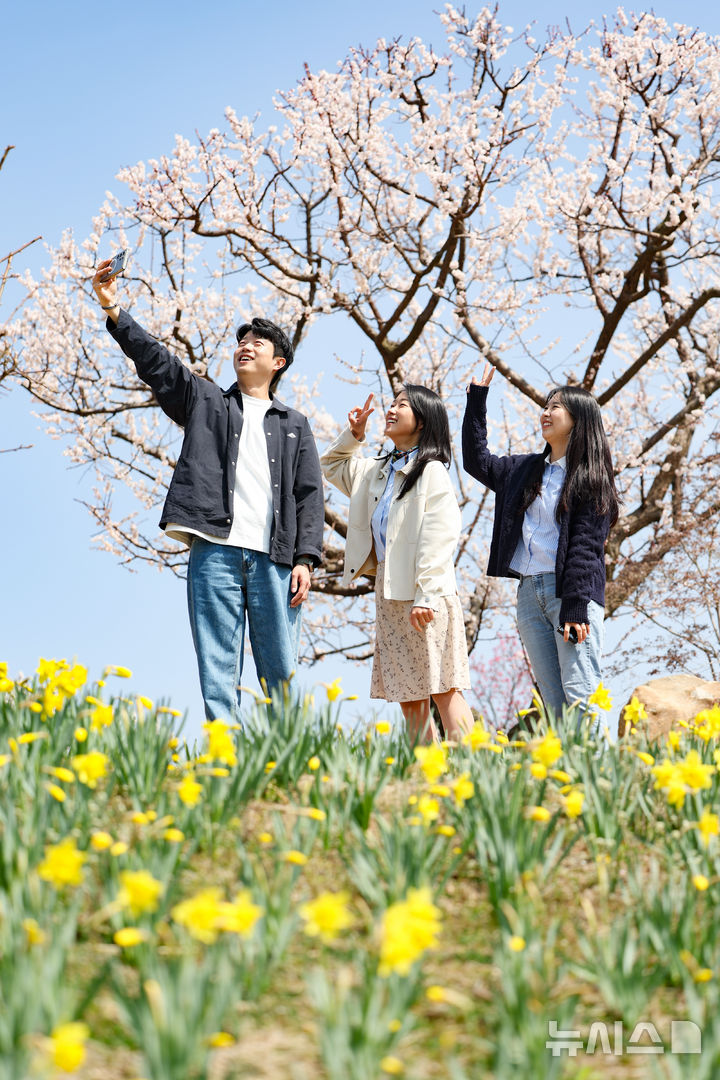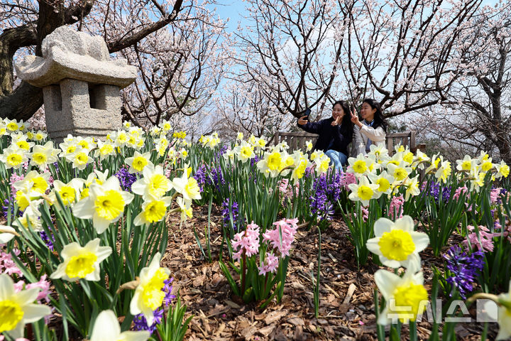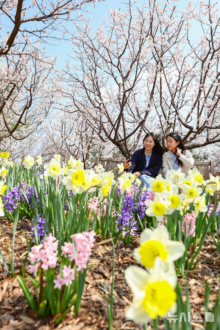 【NEWSIS】8日、京畿道竜仁市にあるエバーランドのハヌル庭園の道では、訪れた市民が大きく咲いたウメやスイセンなど春の花々を鑑賞しつつ思い出作りをしていた。