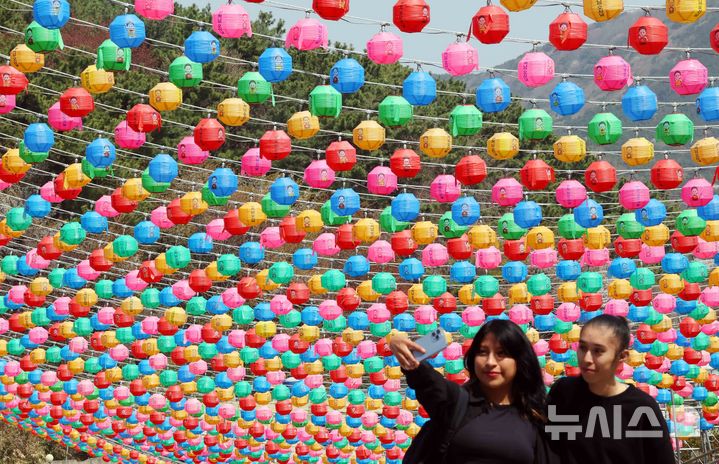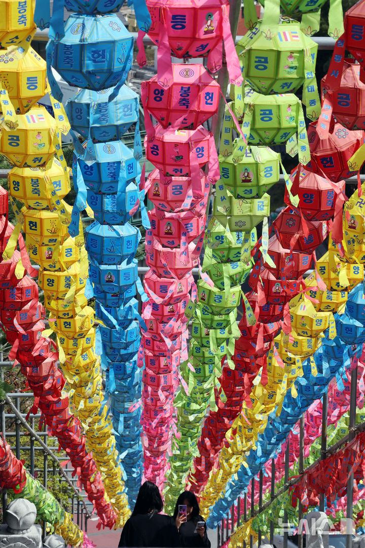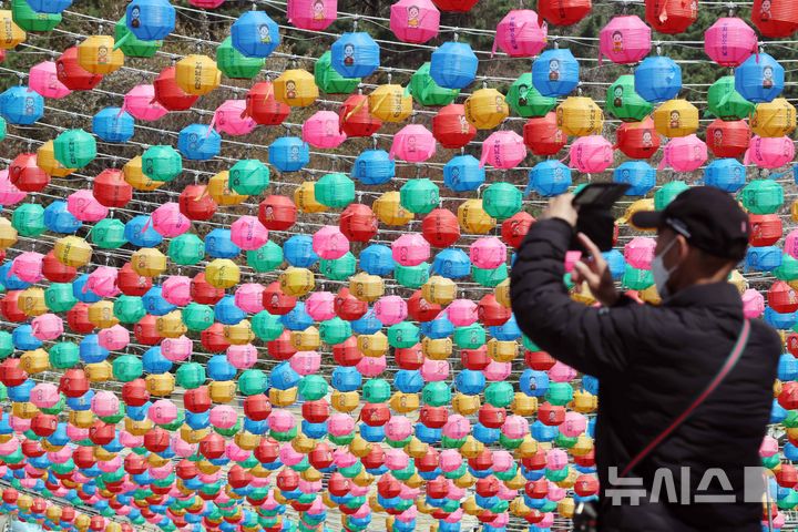 【NEWSIS】8日、釜山市釜山鎮区の三光寺で、色も形もさざまなランタンが設置された様子を見物する外国人観光客。