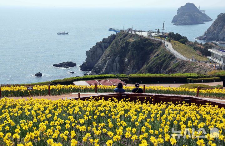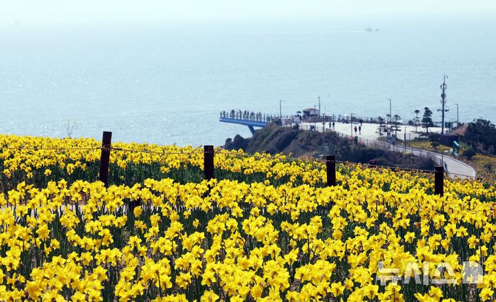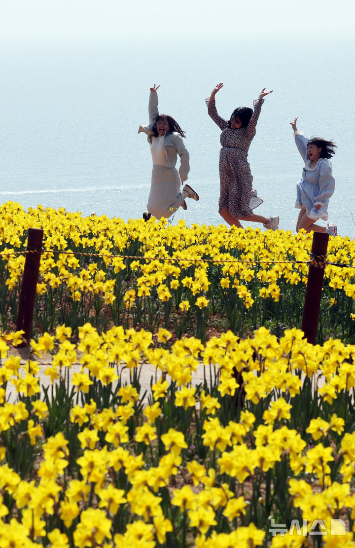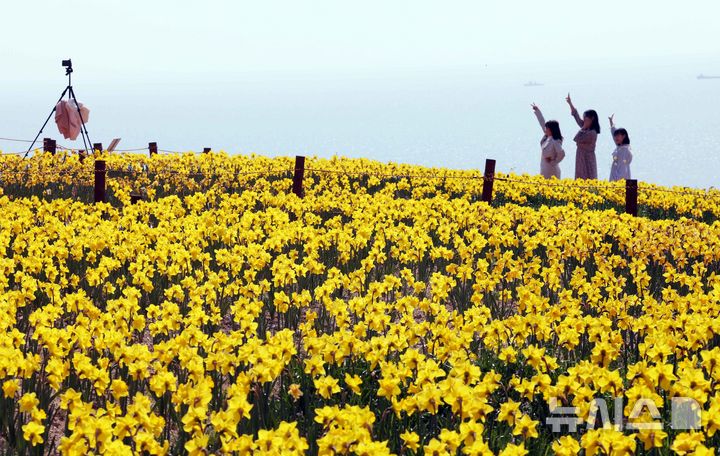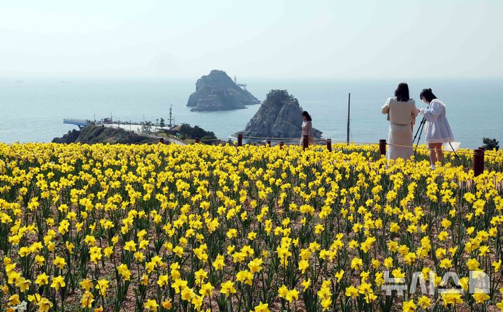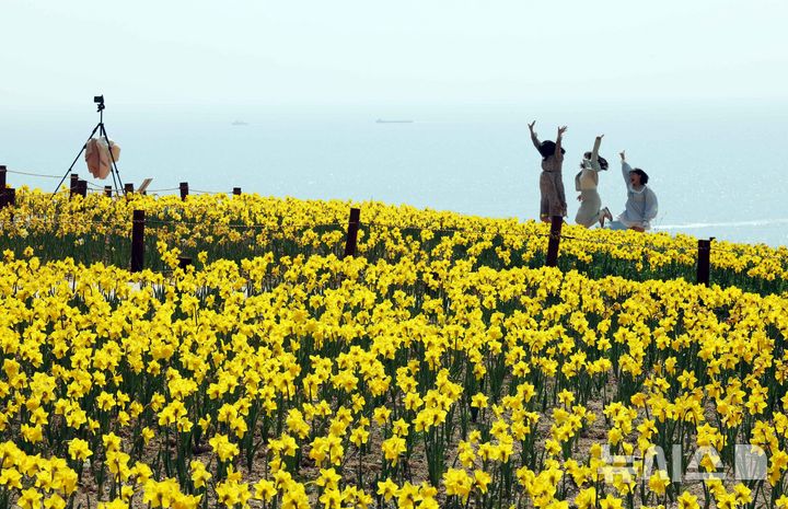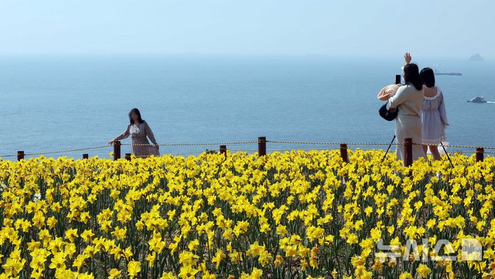 【NEWSIS】はっきりと春の天気になった9日、釜山市南区の五六島日の出公園を訪れた観光客が、大きく咲いたスイセンの花を背景に記念撮影をしている様子。