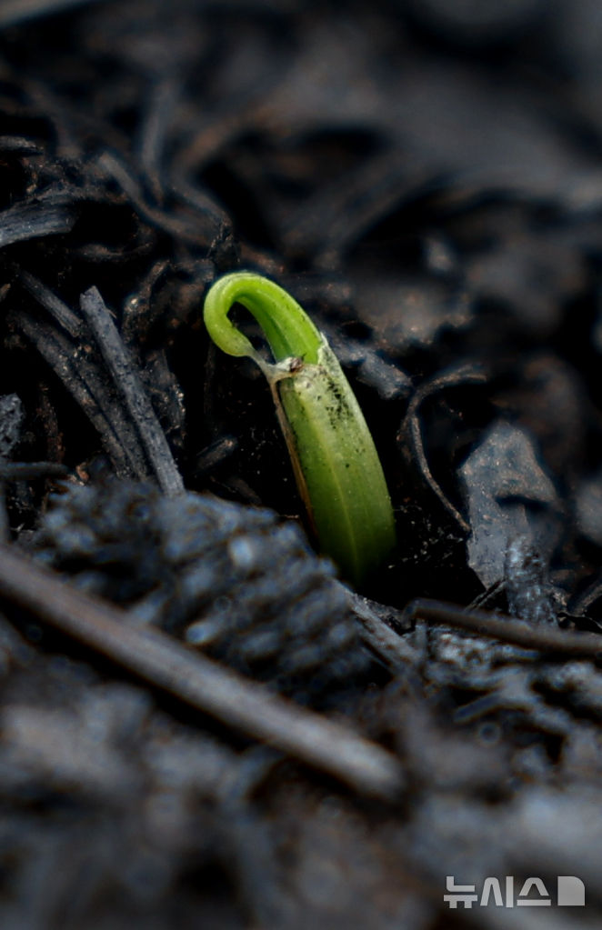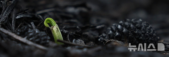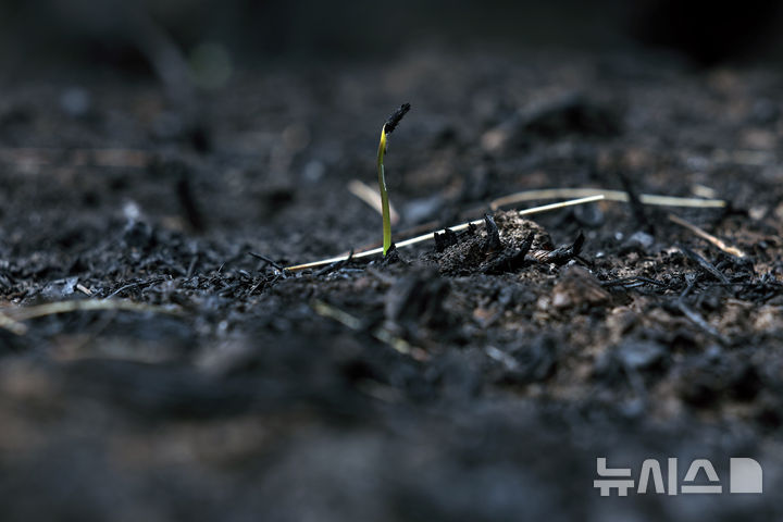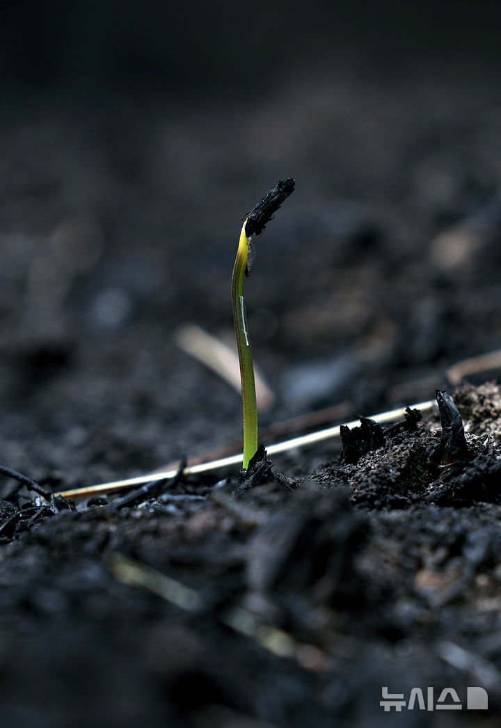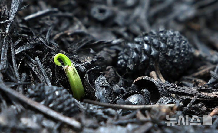 【NEWSIS】大規模な山火事で焼け野原となった慶尚北道安東市吉安面県下里の郊外で9日、新芽が顔を出している様子。
