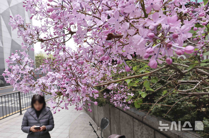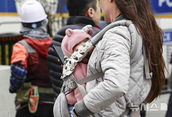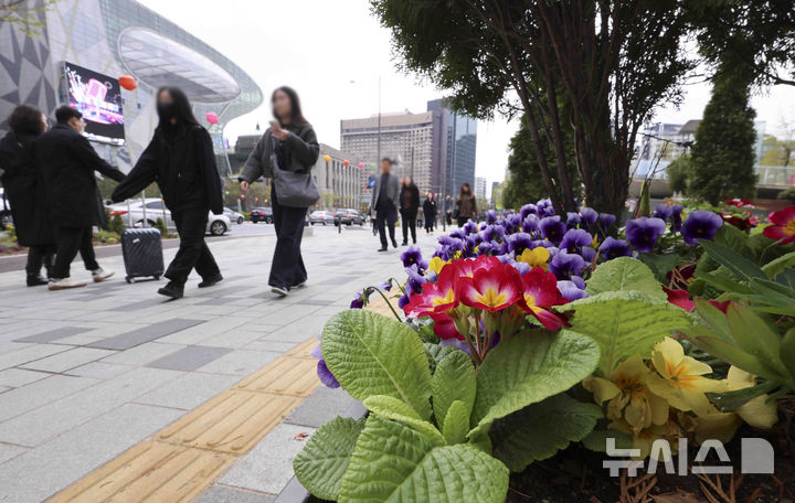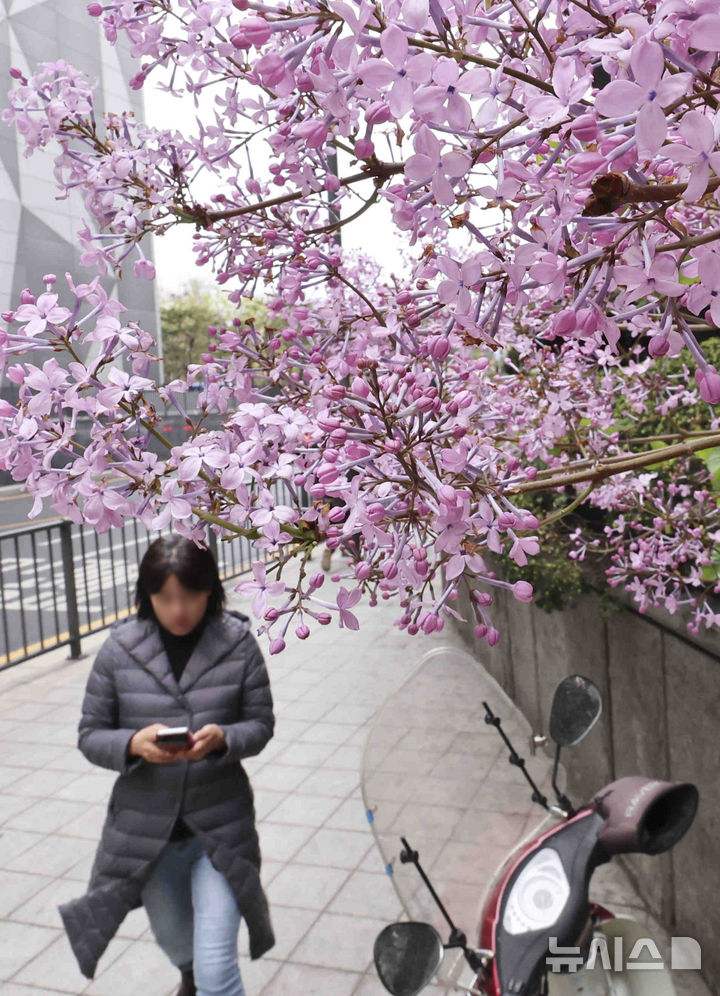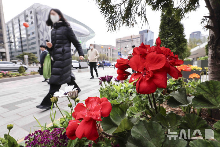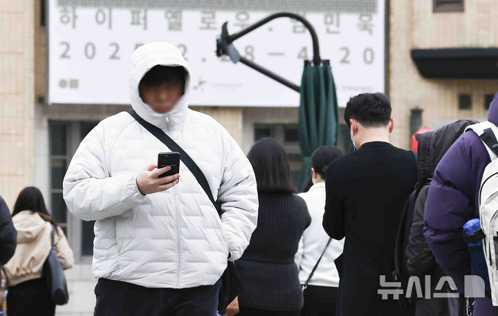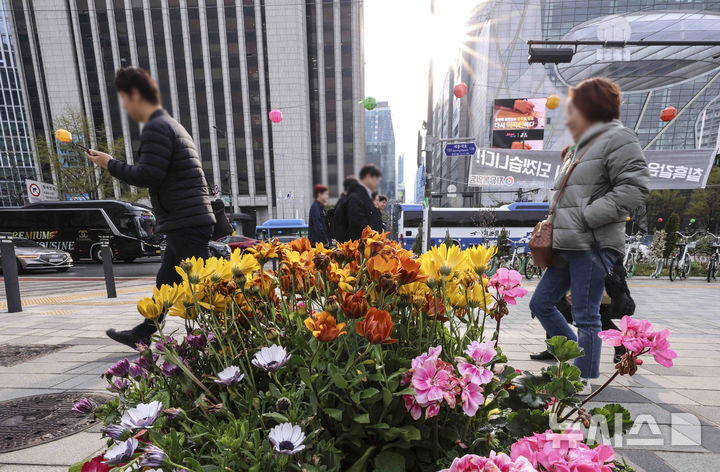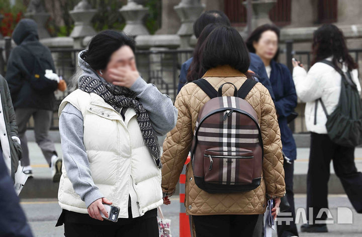 【NEWSIS】韓国全国で強い風が吹き、肌寒さが続いた14日、ソウル市鍾路区の世宗大路で、ダウンジャケットなどで防寒対策をして出勤する人々。