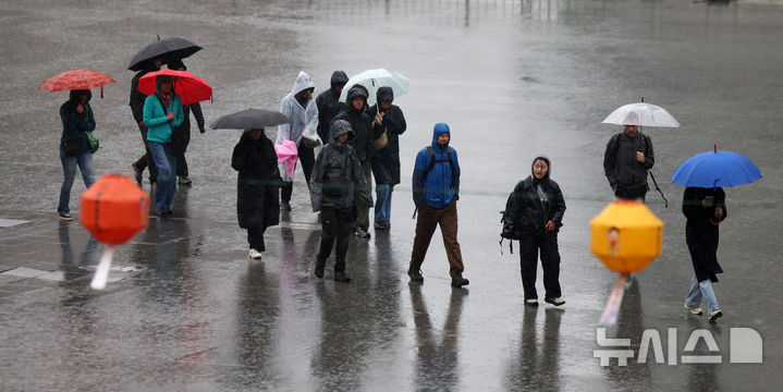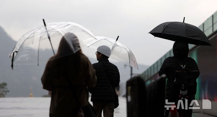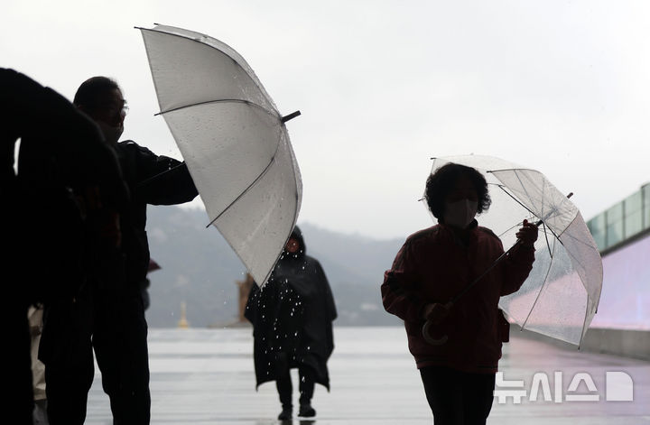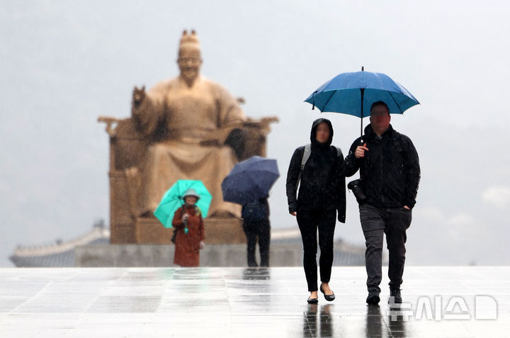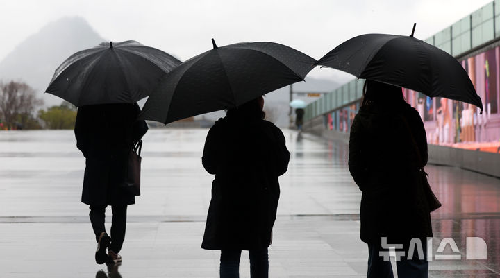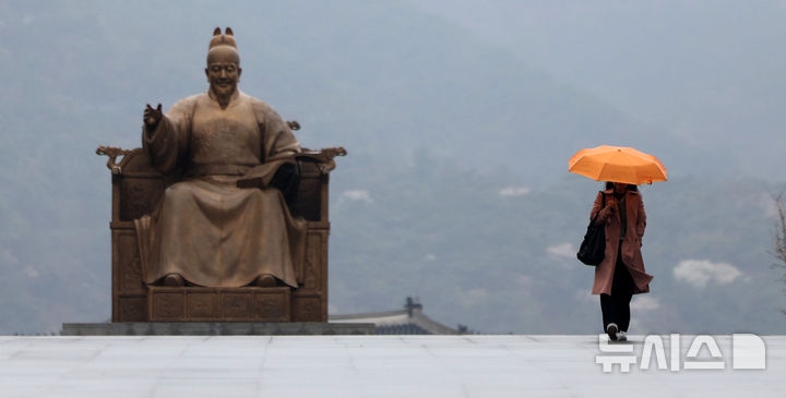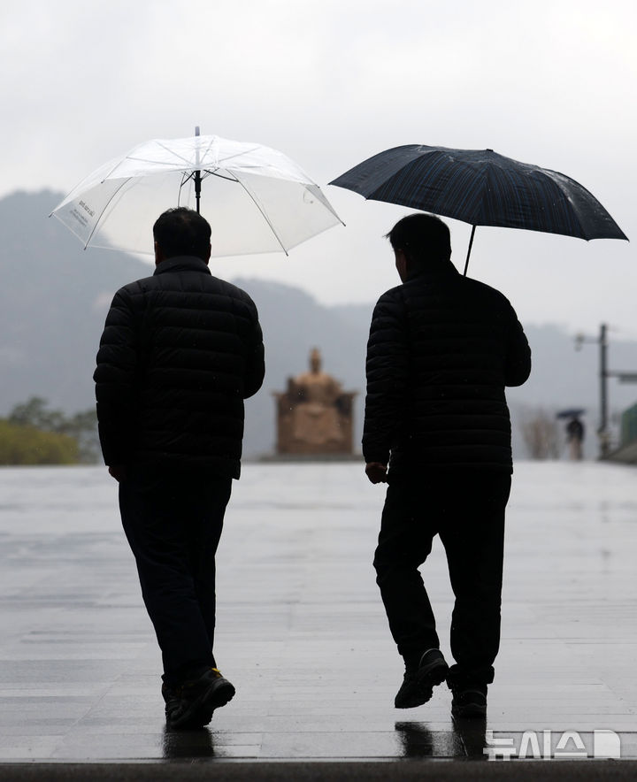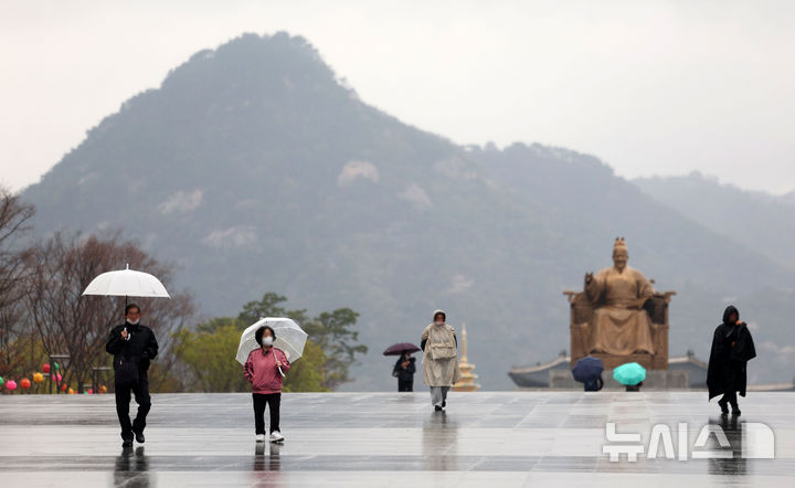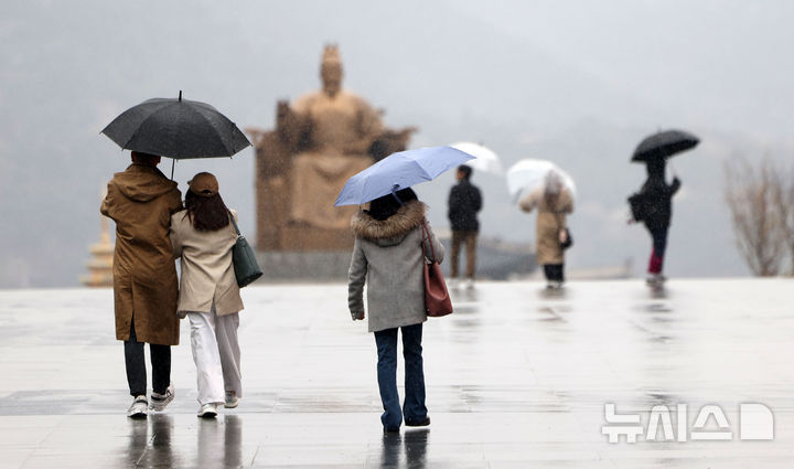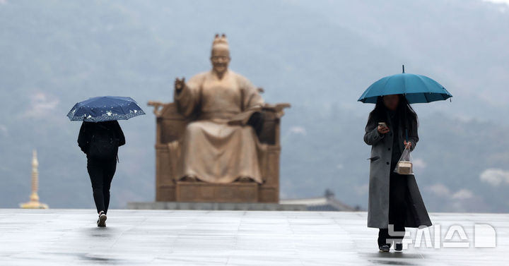 【NEWSIS】韓国首都圏に春雨が降った14日、ソウル市鍾路区の光化門広場で、雨傘を差して道を歩く市民の様子。