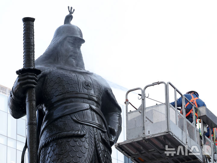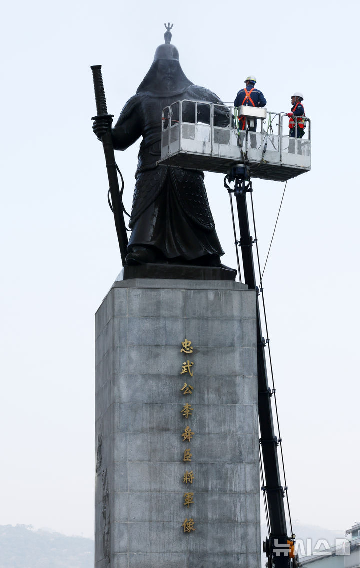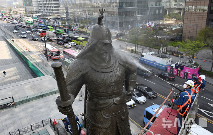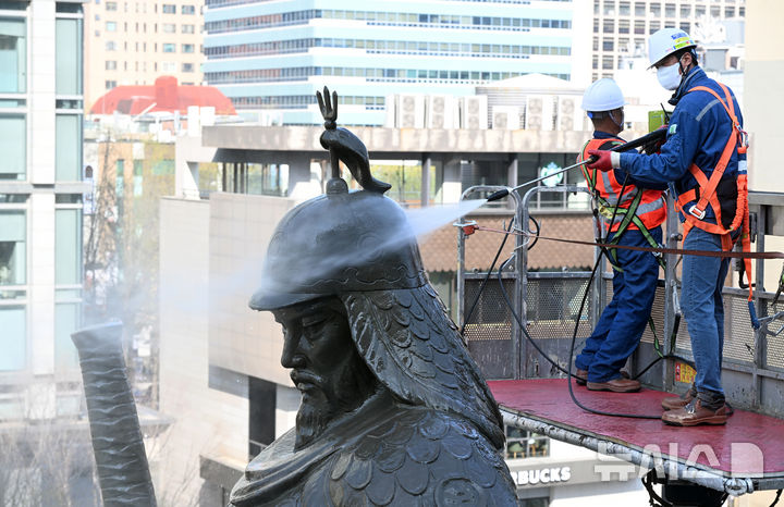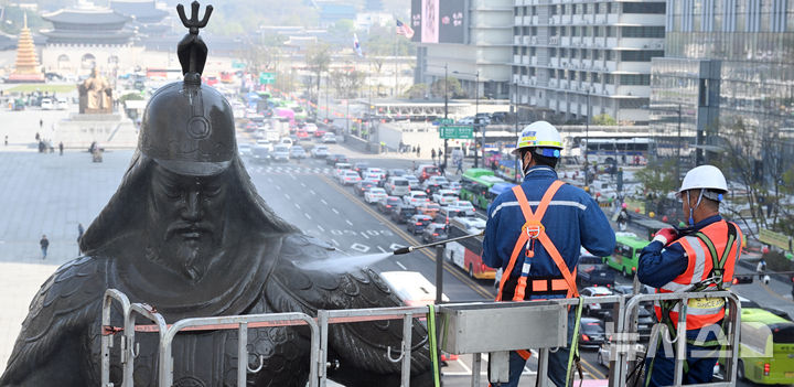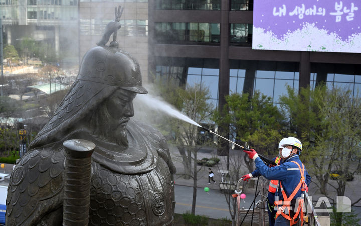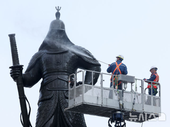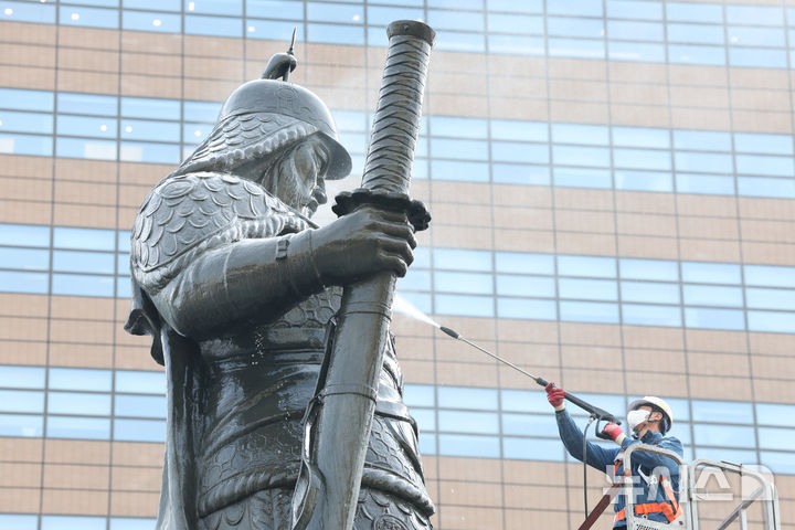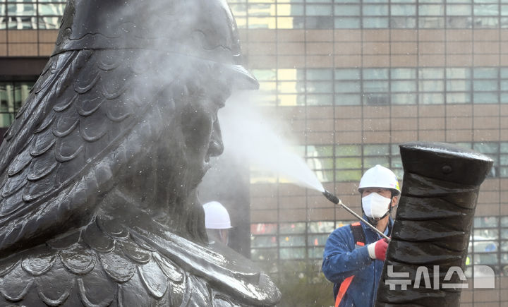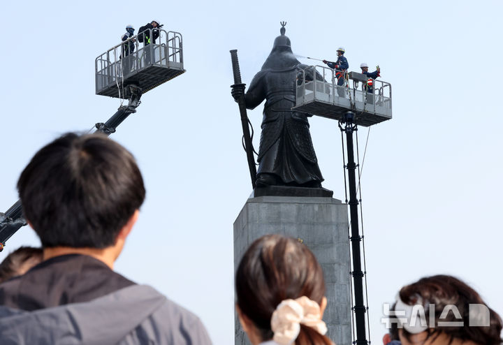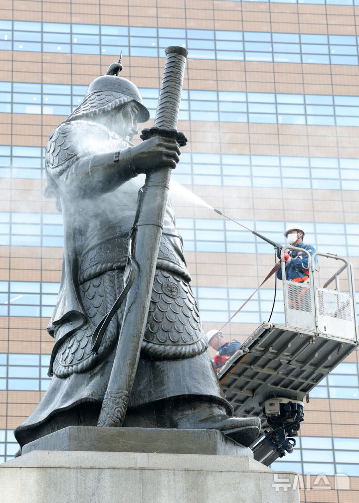 【NEWSIS】16日午前、ソウル市鍾路区の光化門広場で、李舜臣(イ・スンシン)将軍像の洗浄作業が行われた。写真=共同取材