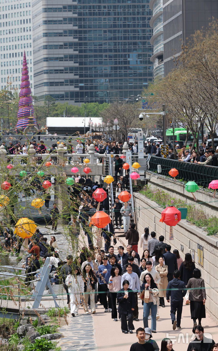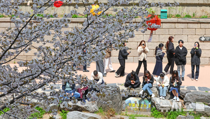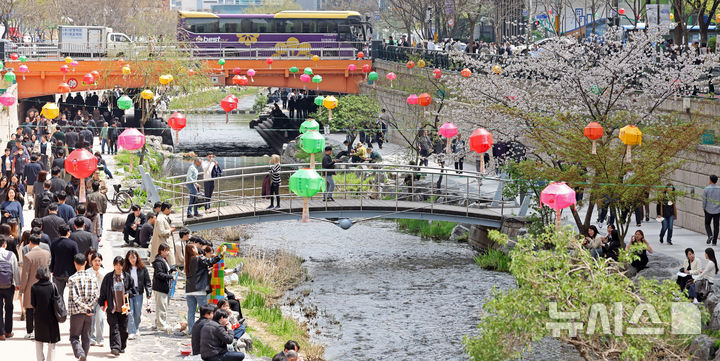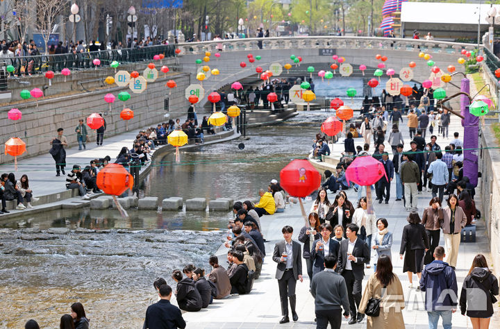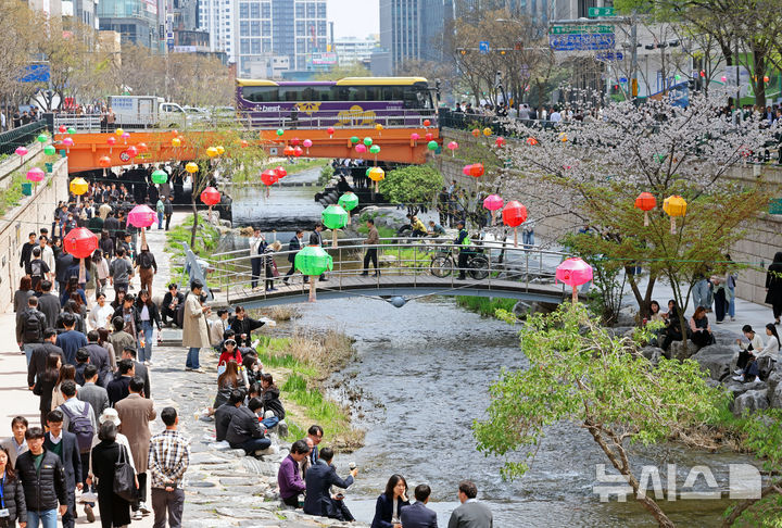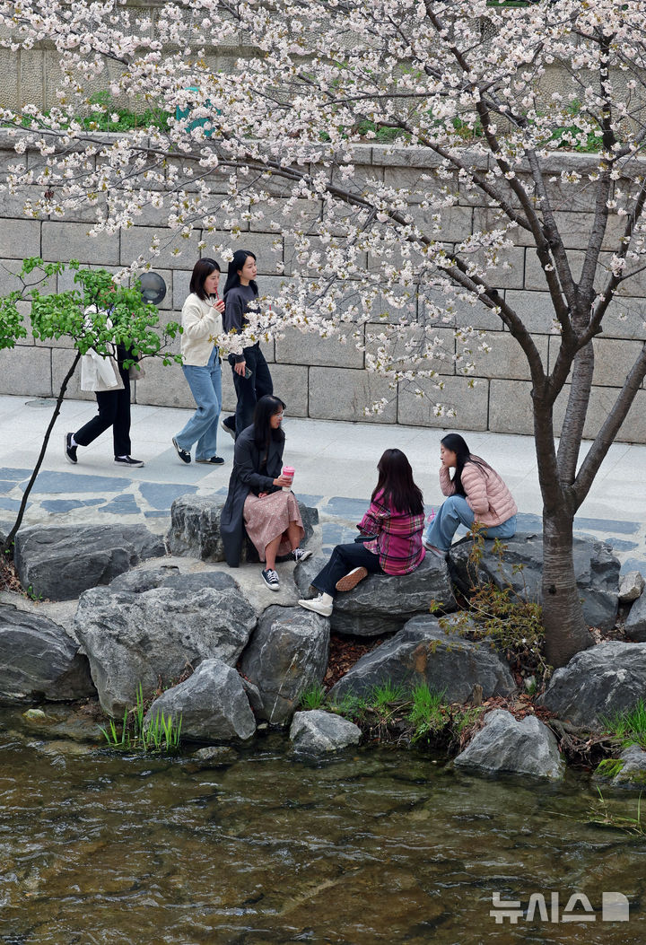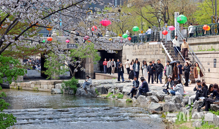 【NEWSIS】平年の気温を取り戻し、はっきりとした春の天気になった16日、ソウル市中区の清渓川で一休みしている市民の様子。
