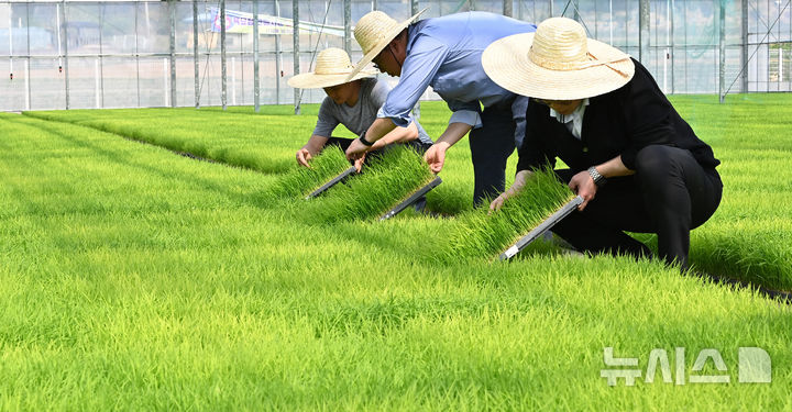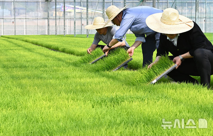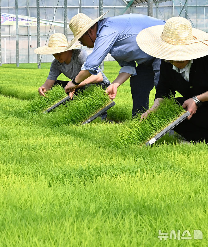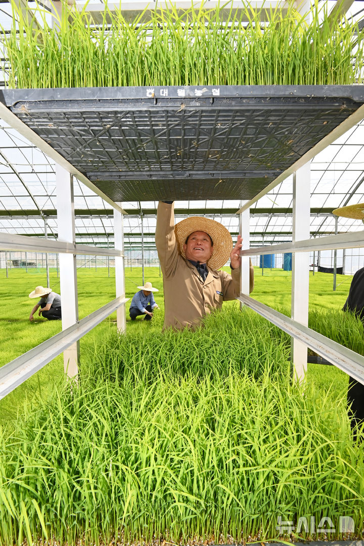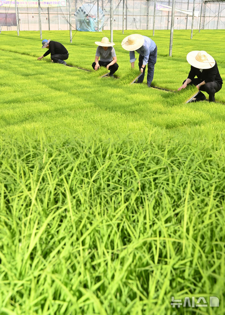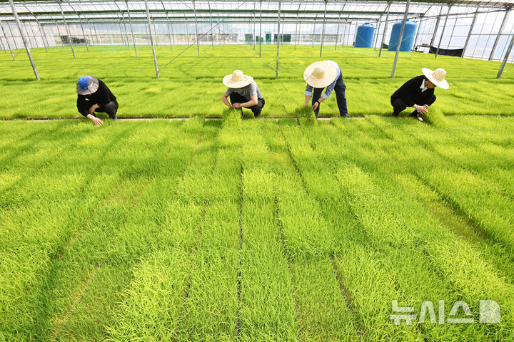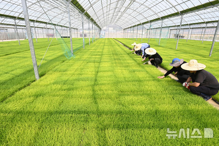 【NEWSIS】二十四節季の一つで、農耕の始まりを告げる「穀雨」まであと四日と迫った17日、京畿道利川市にある大月農協共同育苗場では、関係者が「モ板」と呼ばれる育苗用の箱で育てたイネの苗の生育状態を調べていた。