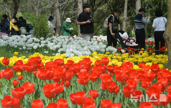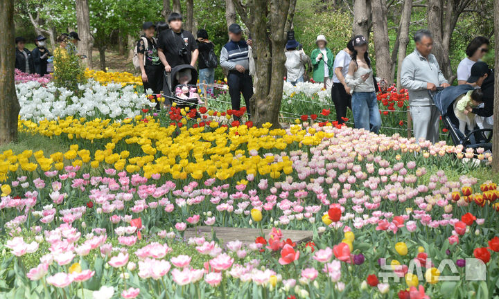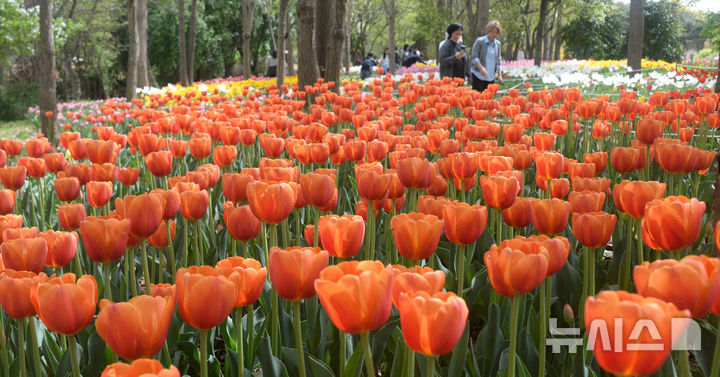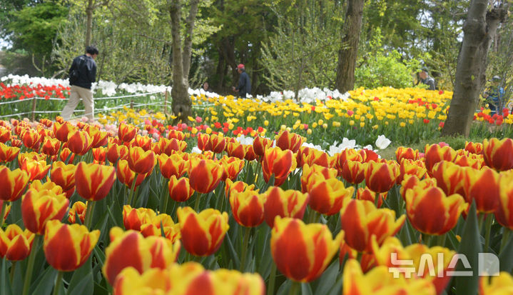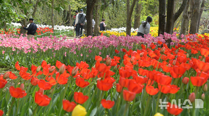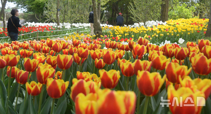 【NEWSIS】連日本格的な春の天気が続いている17日、全羅北道全州市の韓国道路公社全州樹木院で満開を迎えたチューリップの様子。